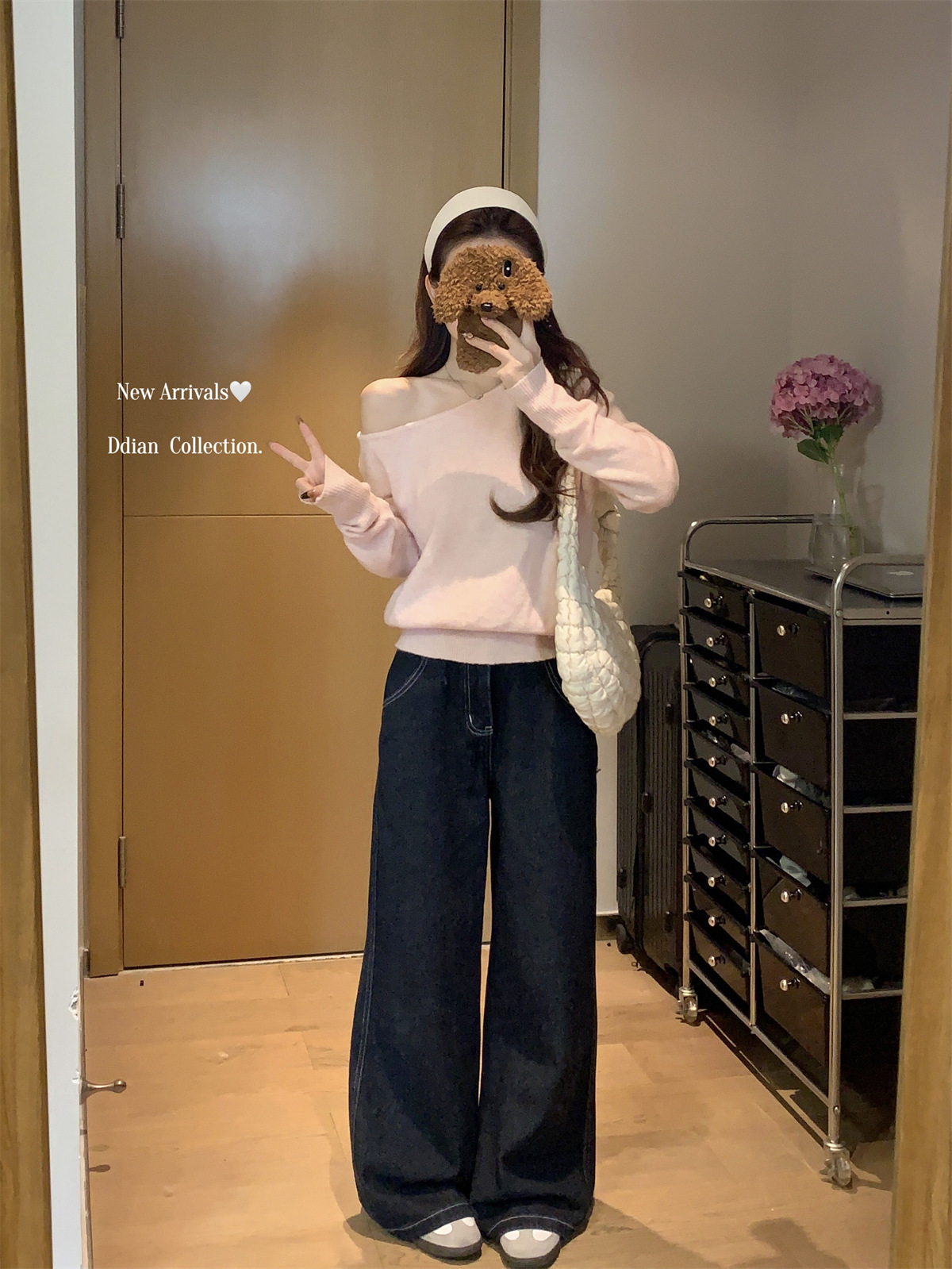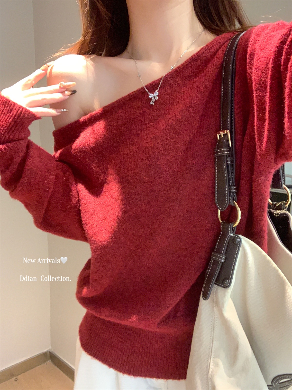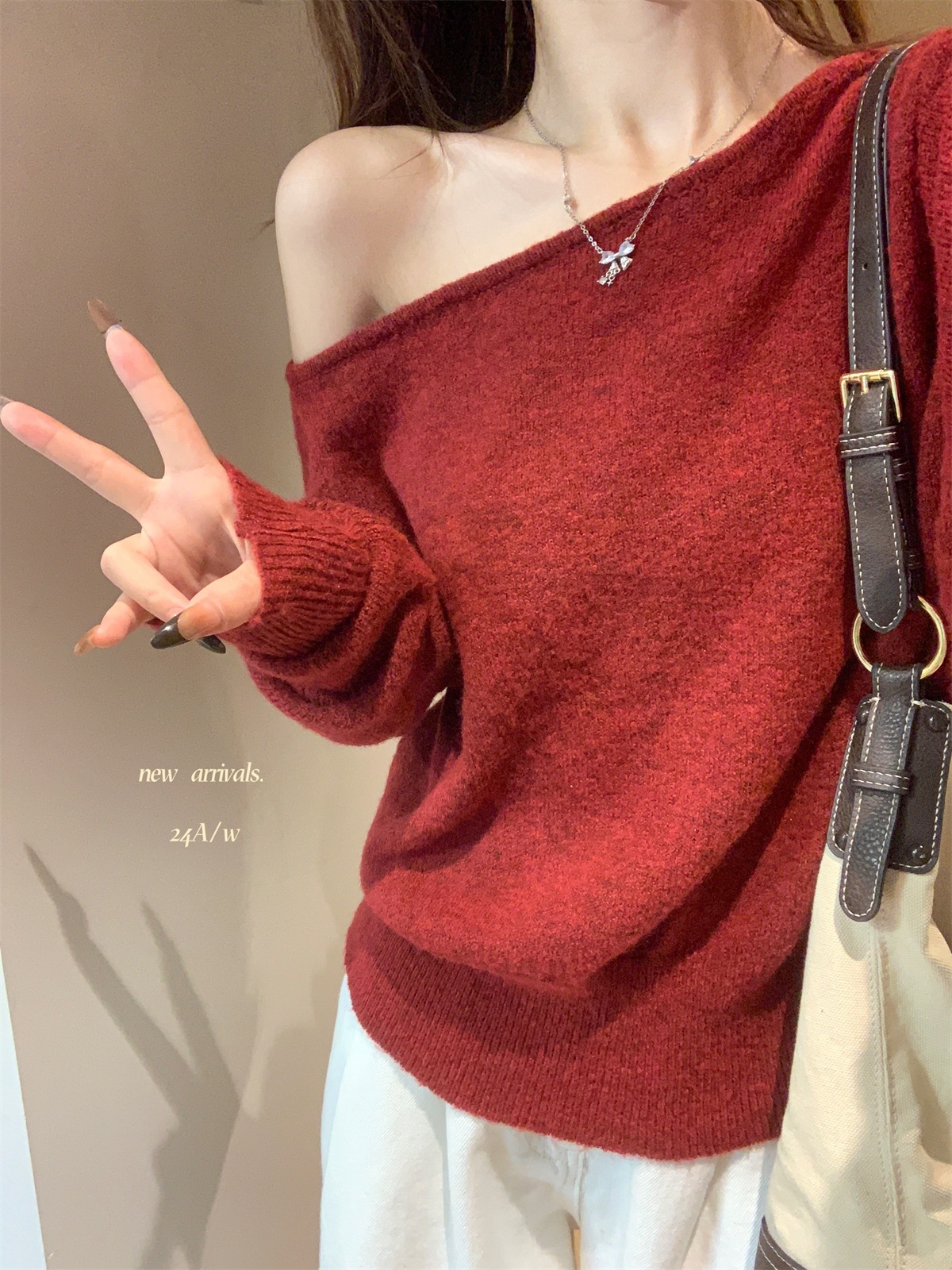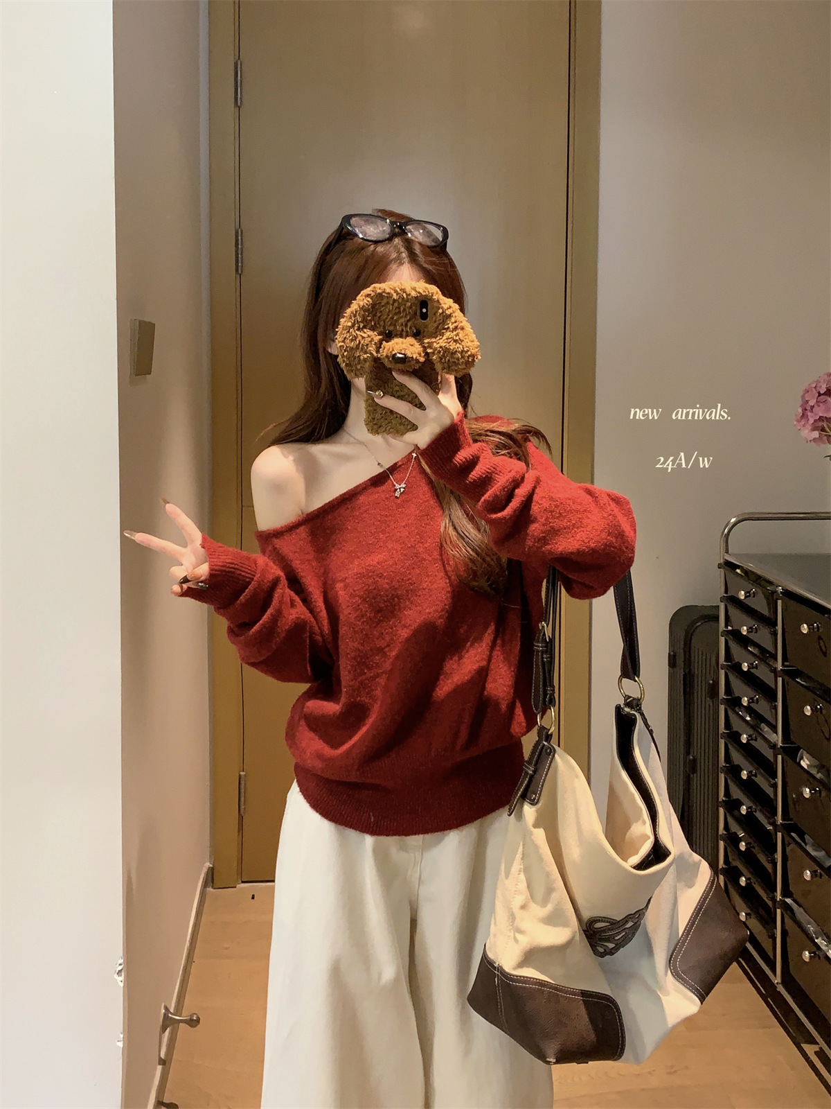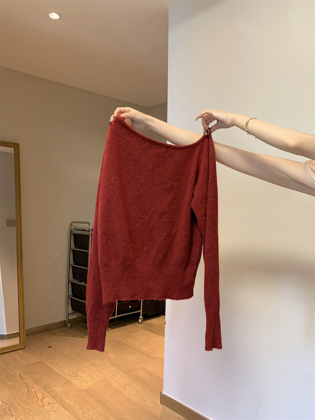 JMA-1019 实拍 秋冬韩版气质斜肩甜美百搭6羊毛针织长袖打底上衣毛衣