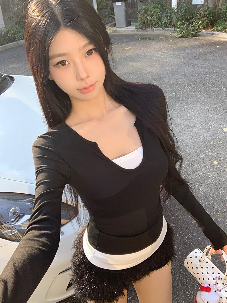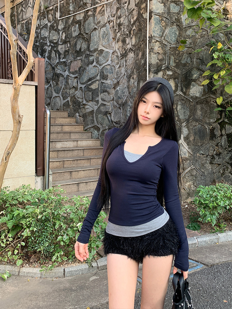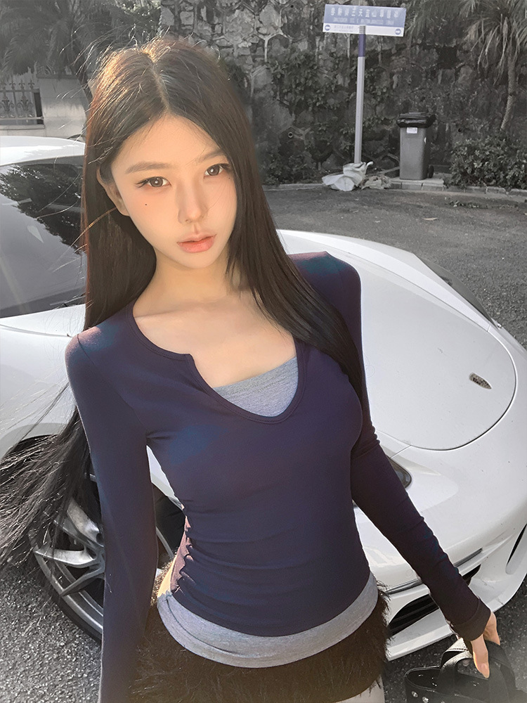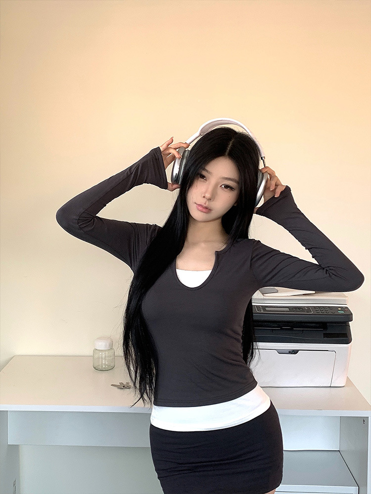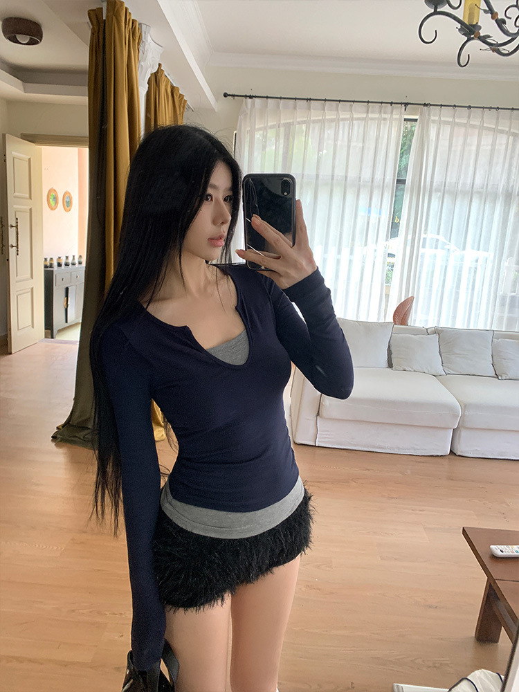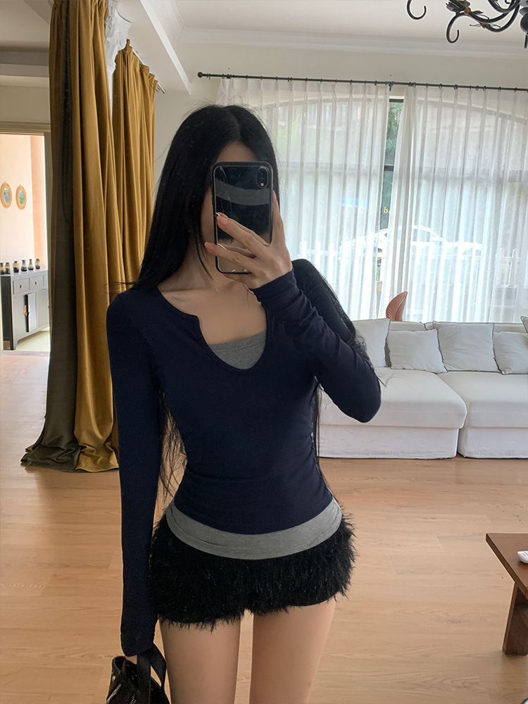 JMA-1021 实拍 2025春装新款美式复古假两件长袖T恤拼接撞色辣妹上衣打底衫JMA-1030