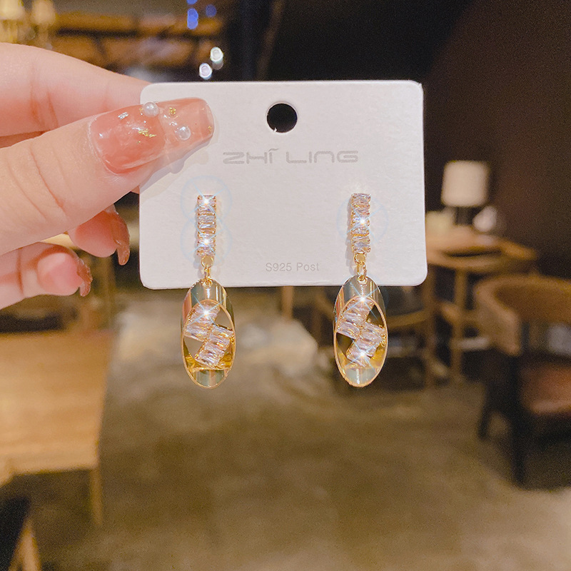 JM-1433 925银针韩国东大门几何椭圆镂空耳环ins时尚气质超闪锆石耳钉饰品
