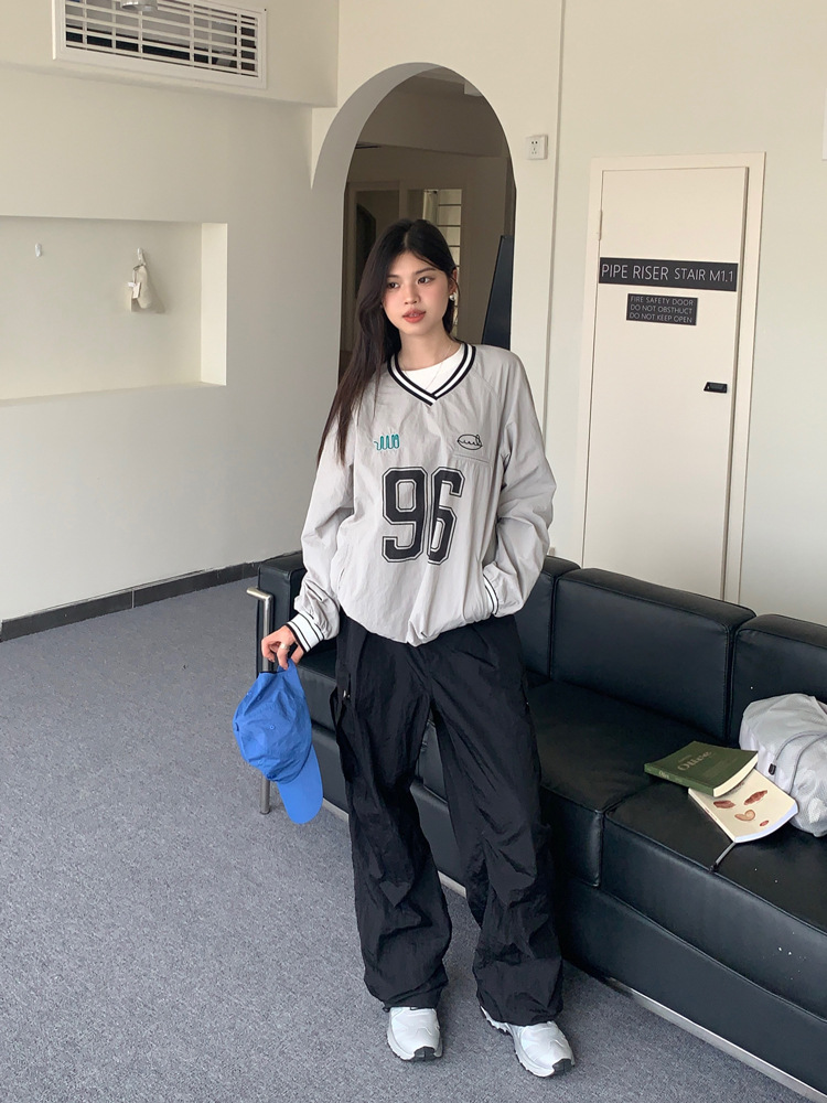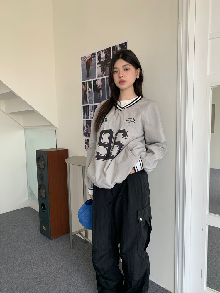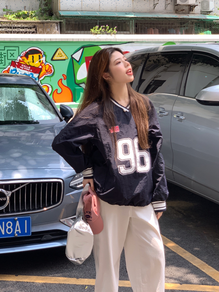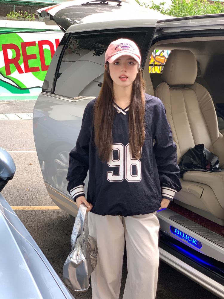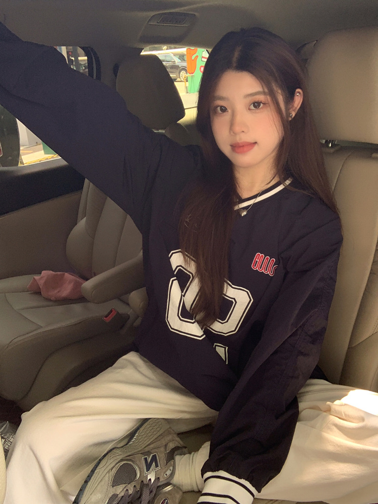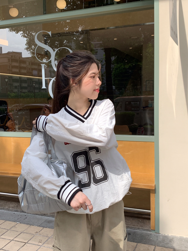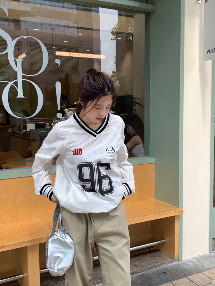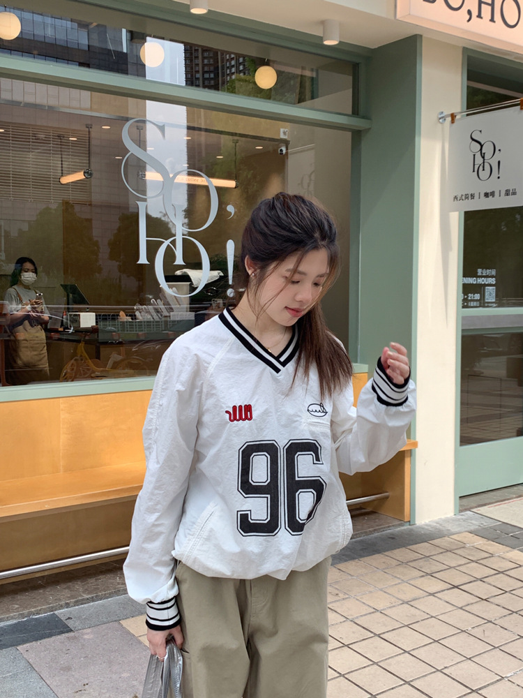 JMA-1031 实拍美式街头风v领撞色字母球衣上衣秋季新款韩版长袖薄款卫衣女