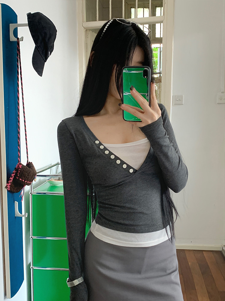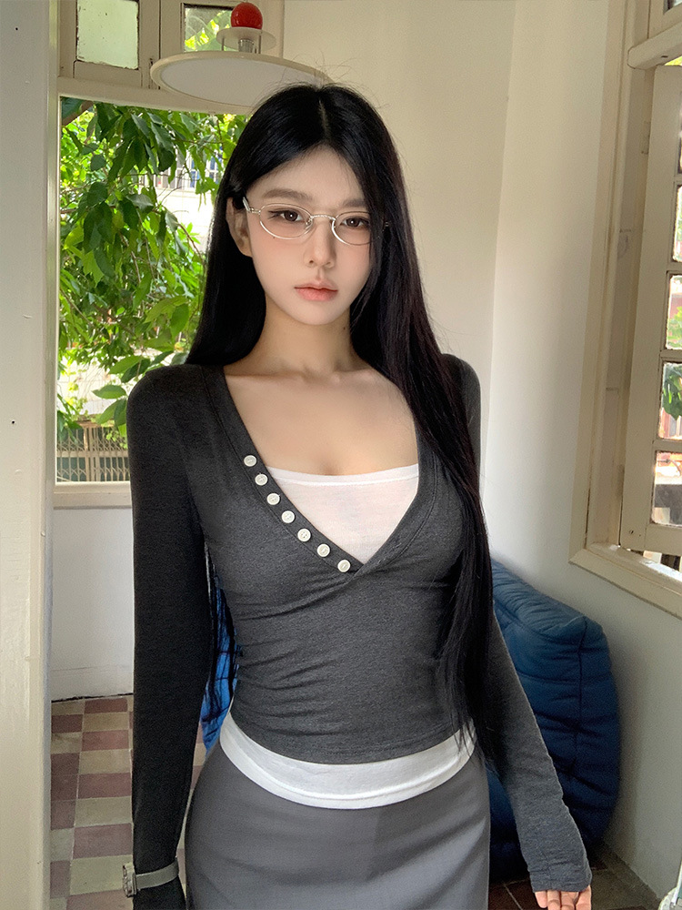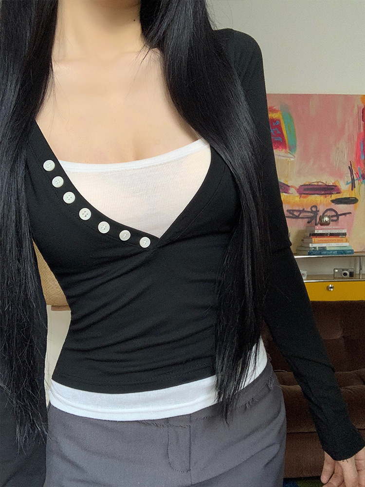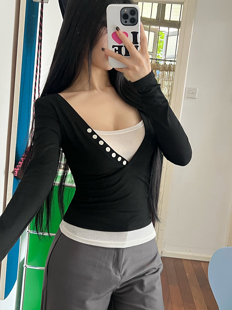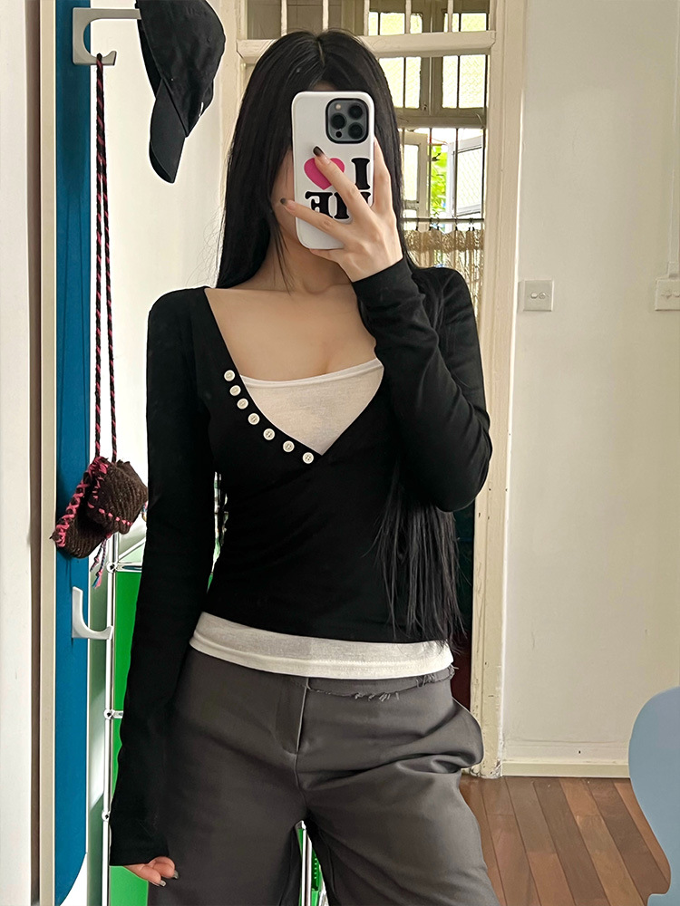 JMA-1033 实拍 春新款美式辣妹假两件复古长袖T恤纯欲V领拼接体恤上衣