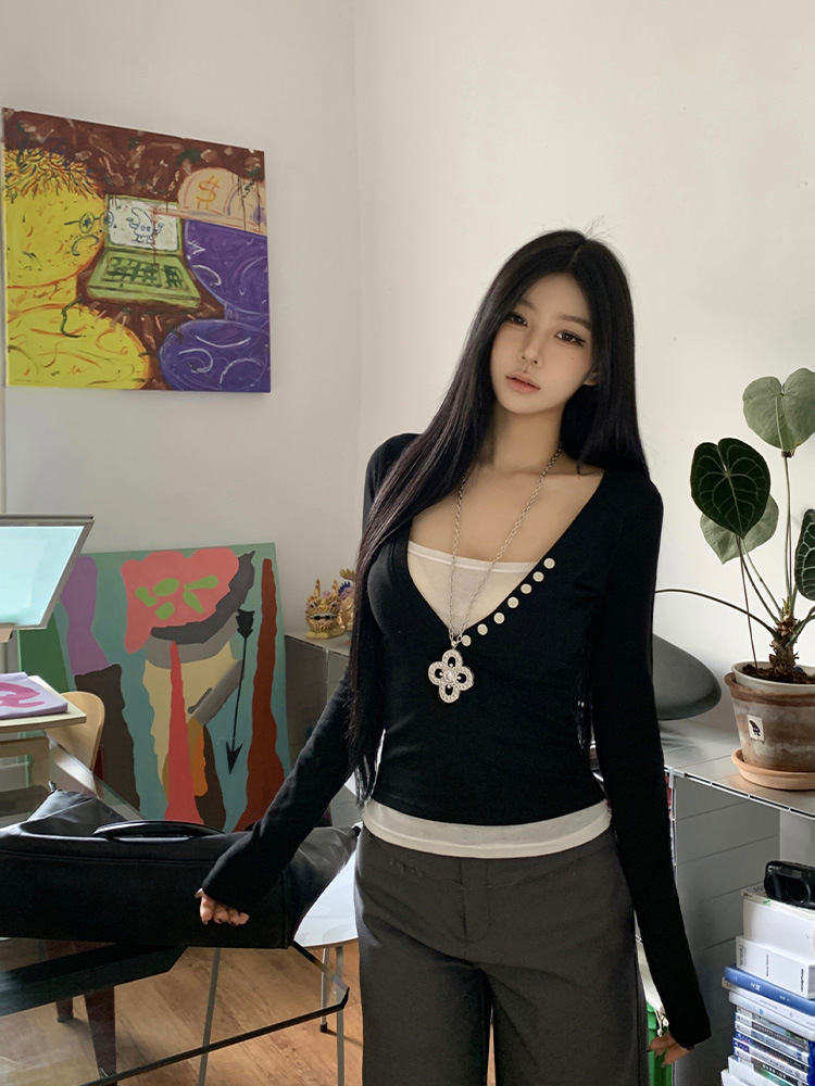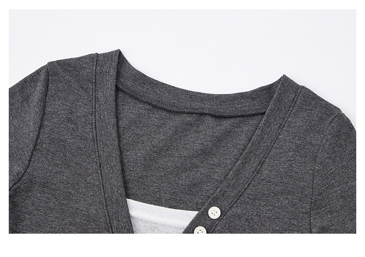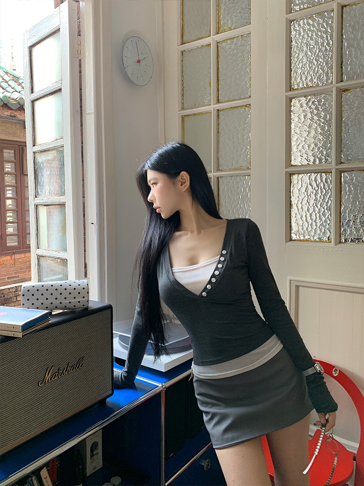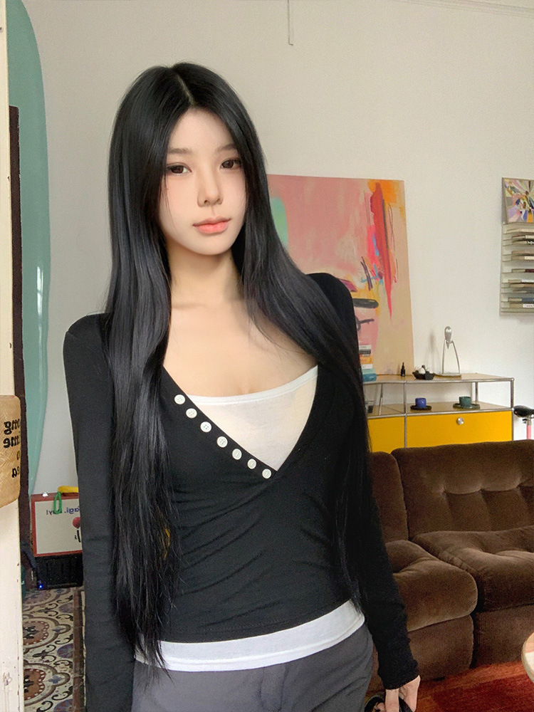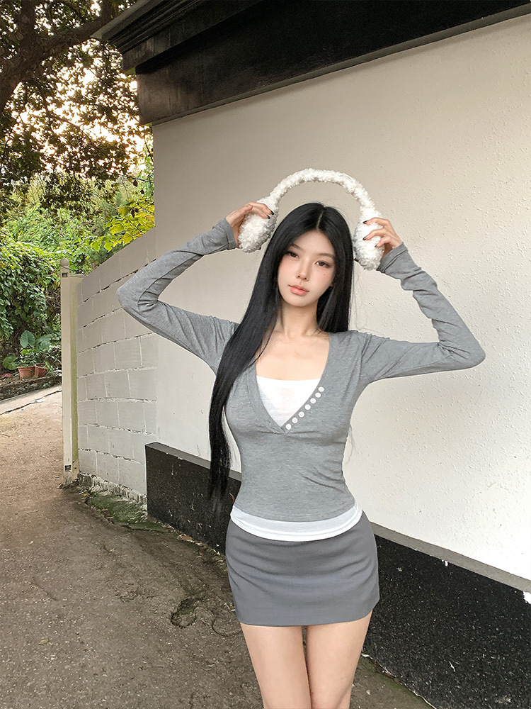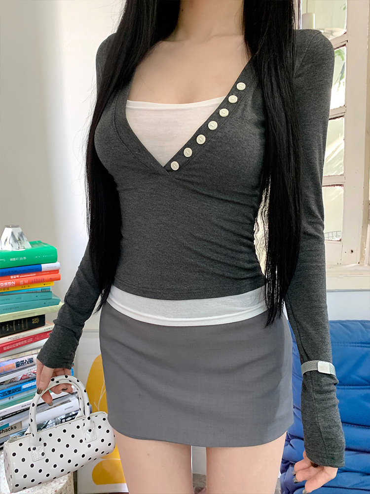 JMA-1033 实拍 春新款美式辣妹假两件复古长袖T恤纯欲V领拼接体恤上衣