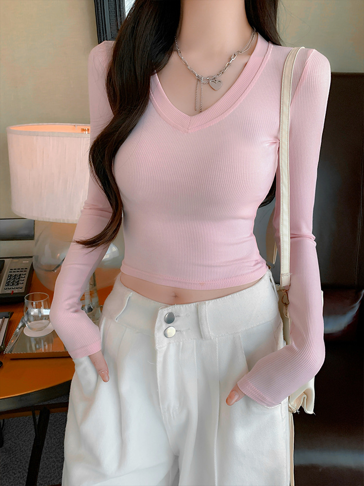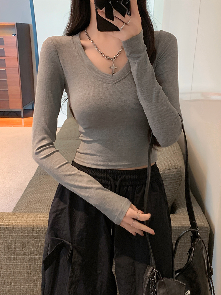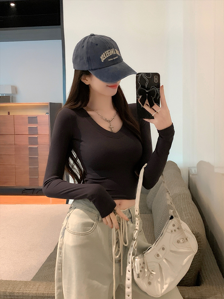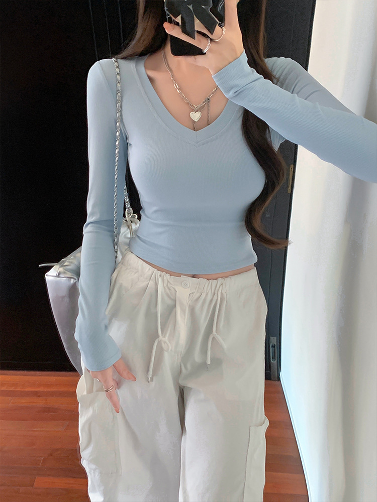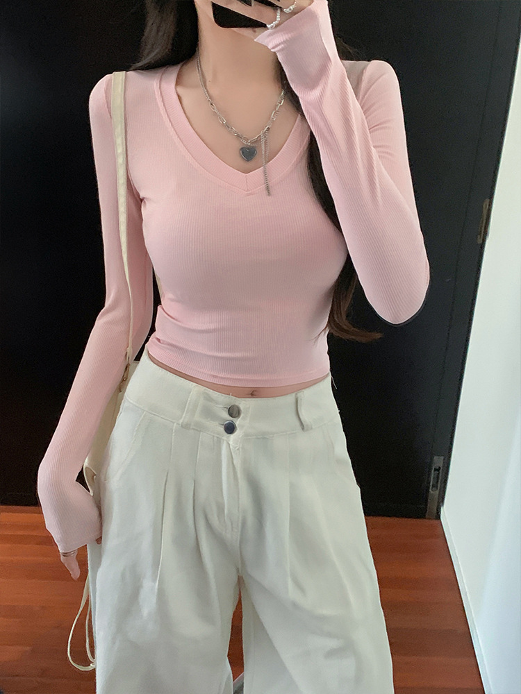 JMA-1037 实拍 春季新款韩版V领短款长袖T恤ins风辣妹韩版修身打底上衣