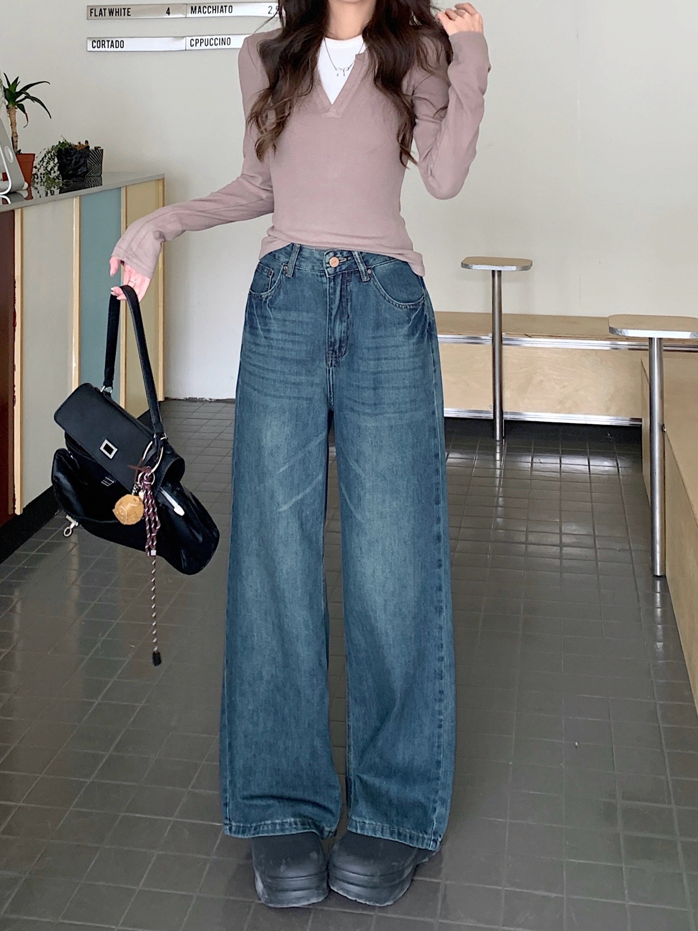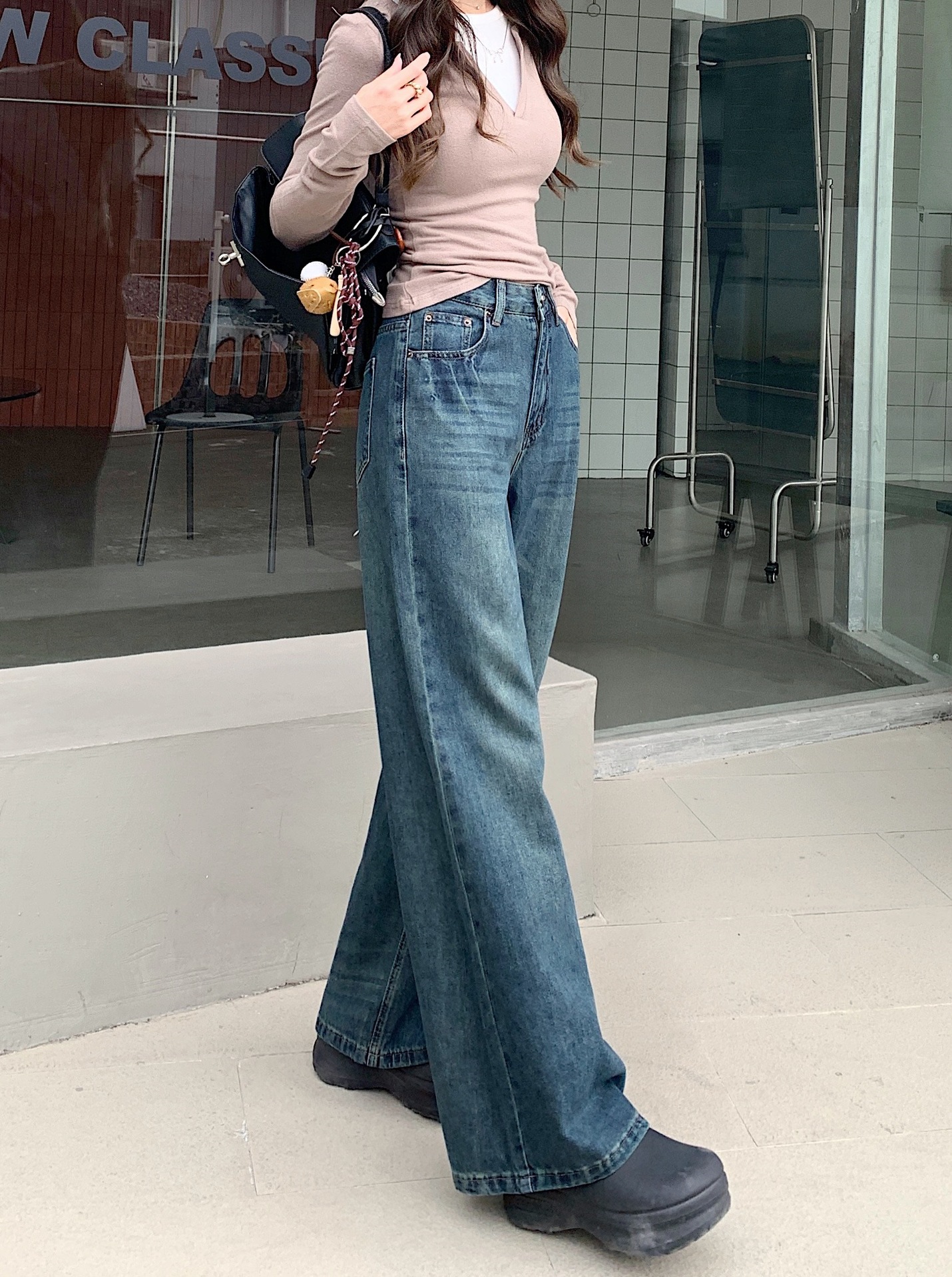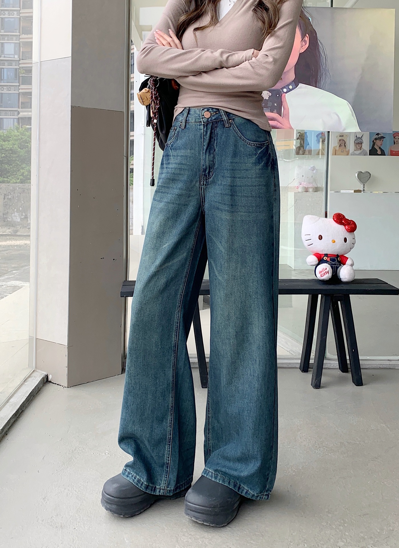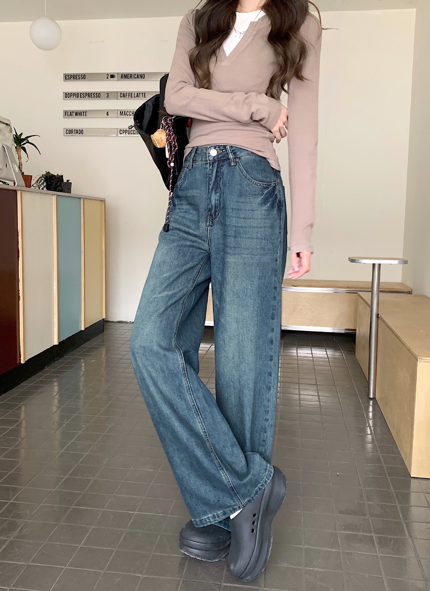 JMA-1040 实拍 春季美式复古蓝色窄版阔腿牛仔裤女宽松直筒牛仔裤拖地长裤