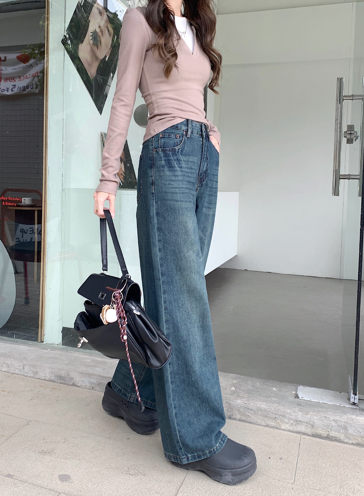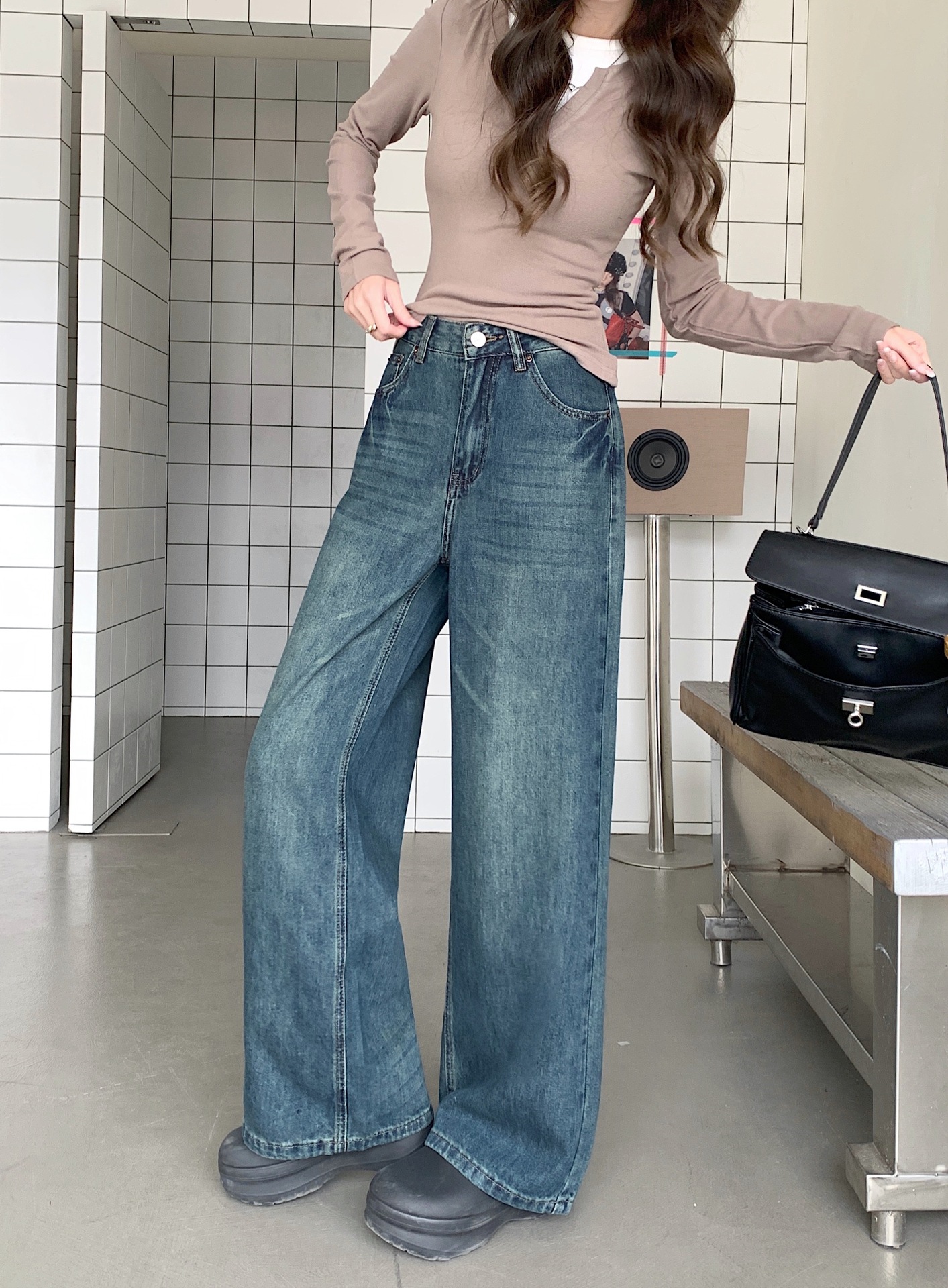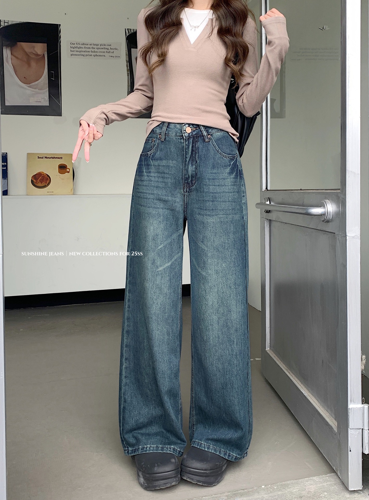 JMA-1040 实拍 春季美式复古蓝色窄版阔腿牛仔裤女宽松直筒牛仔裤拖地长裤