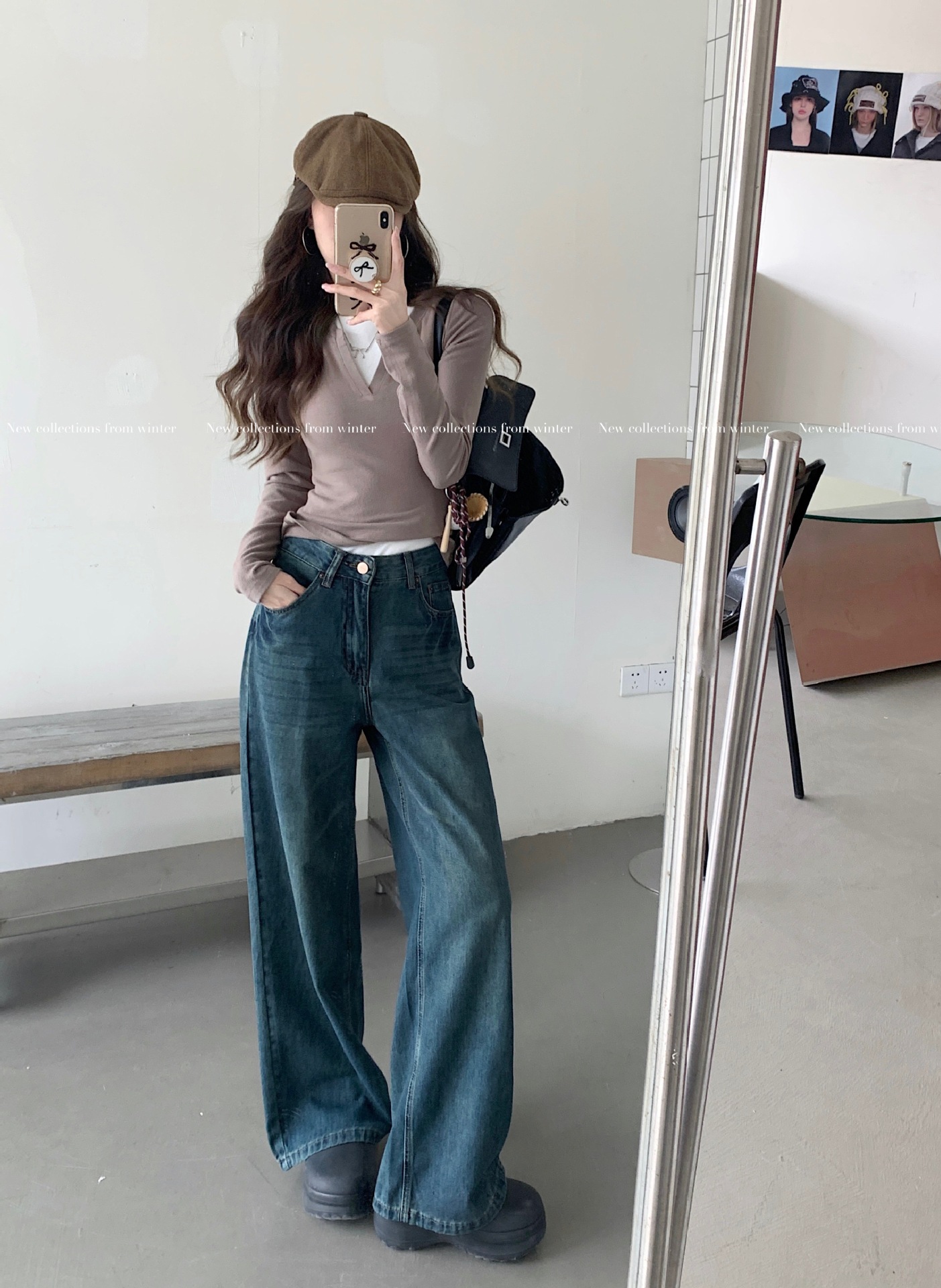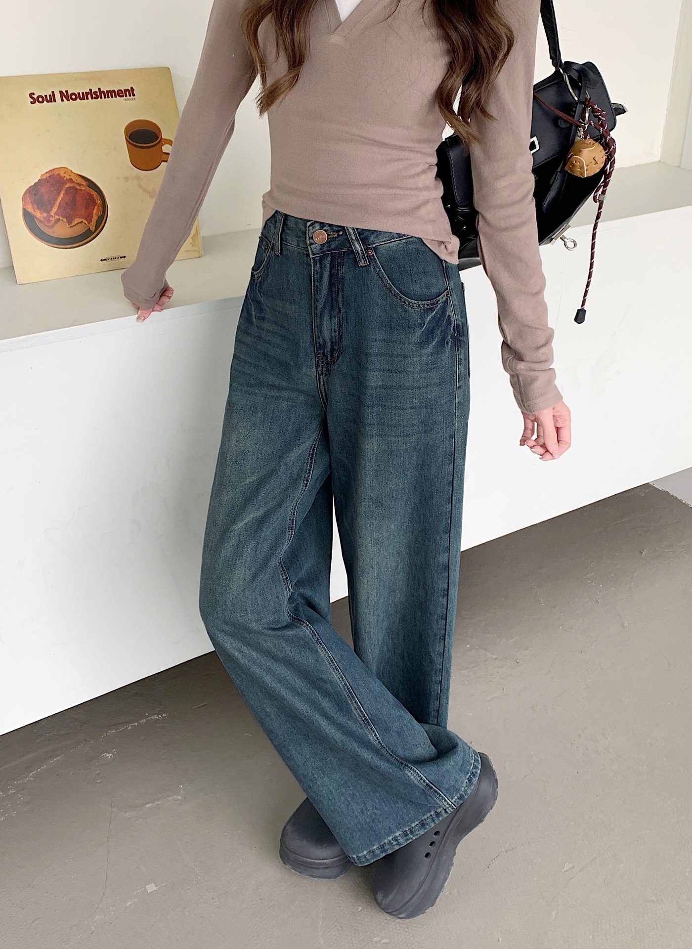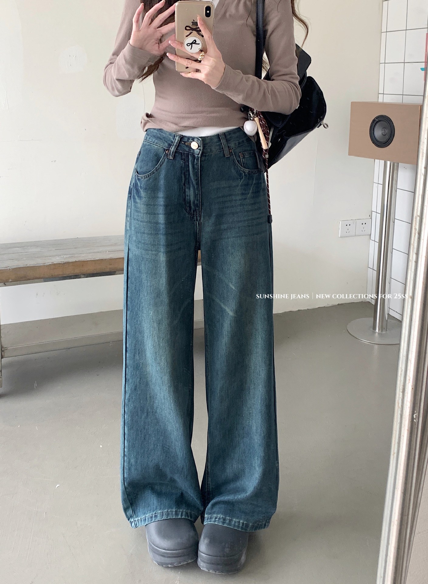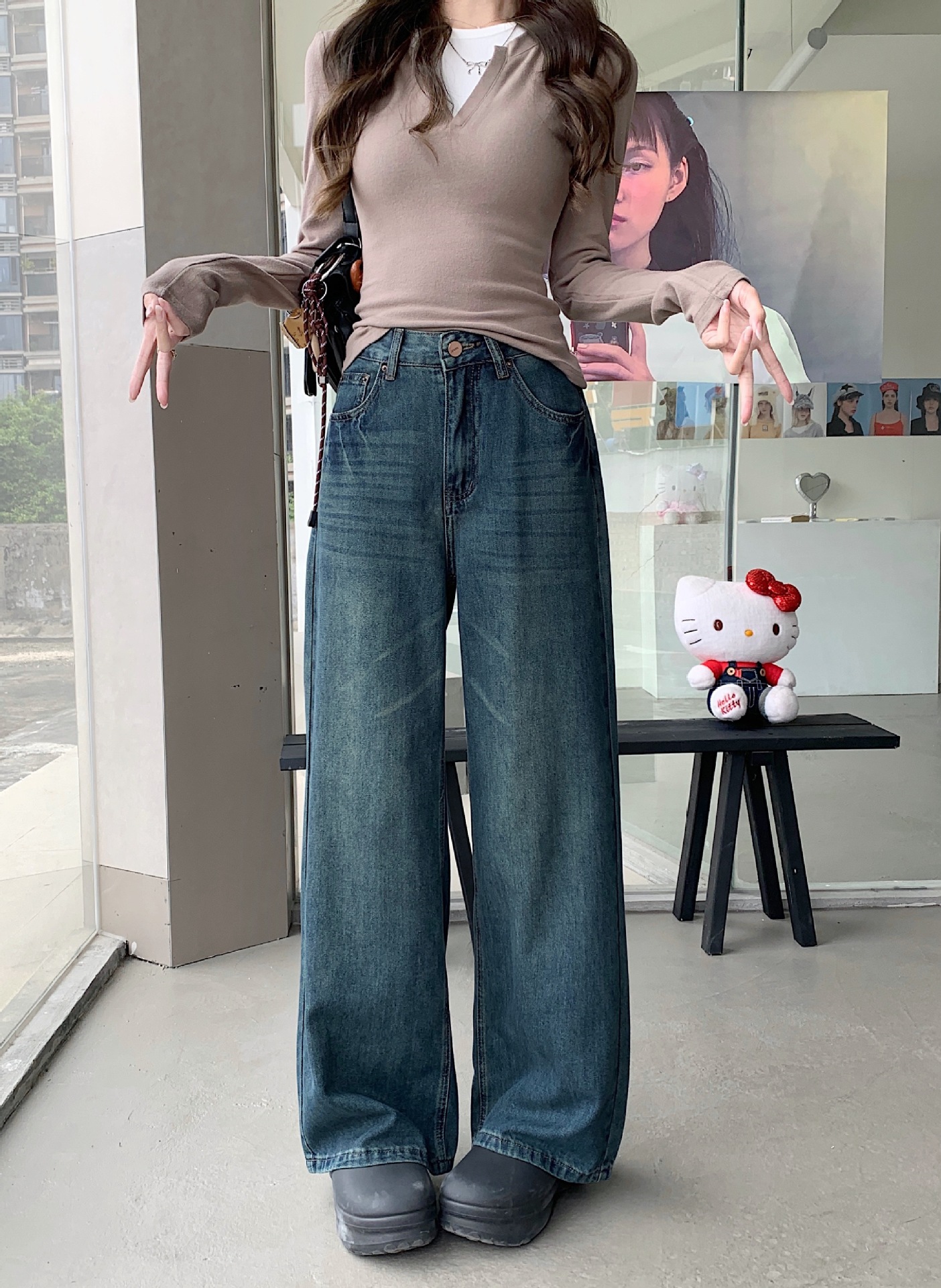 JMA-1040 实拍 春季美式复古蓝色窄版阔腿牛仔裤女宽松直筒牛仔裤拖地长裤
