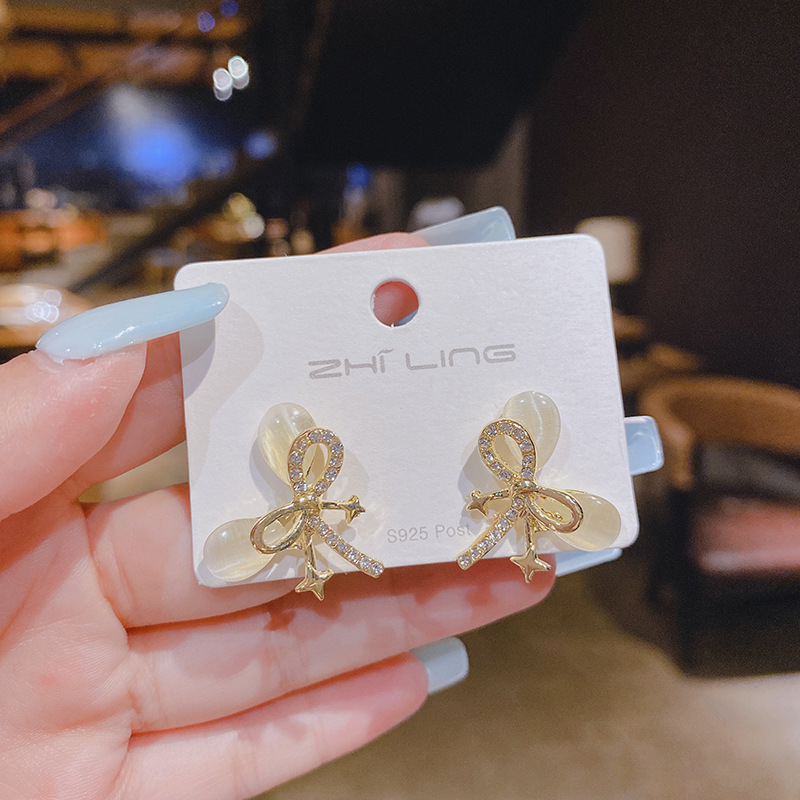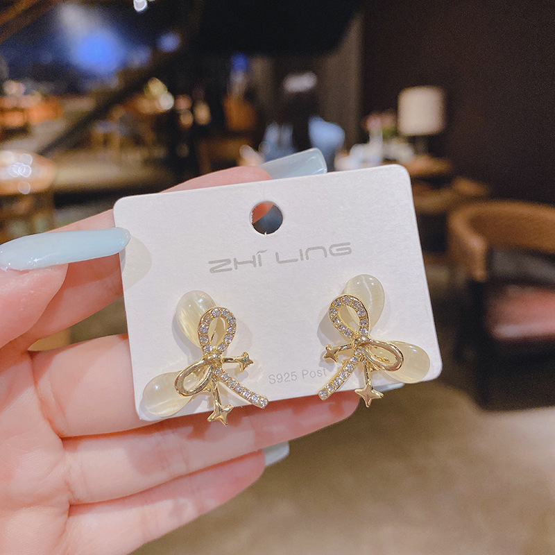JME-1033 S925银针韩国ins东大门蝴蝶结耳环女时尚立体镂空猫眼石耳钉耳饰