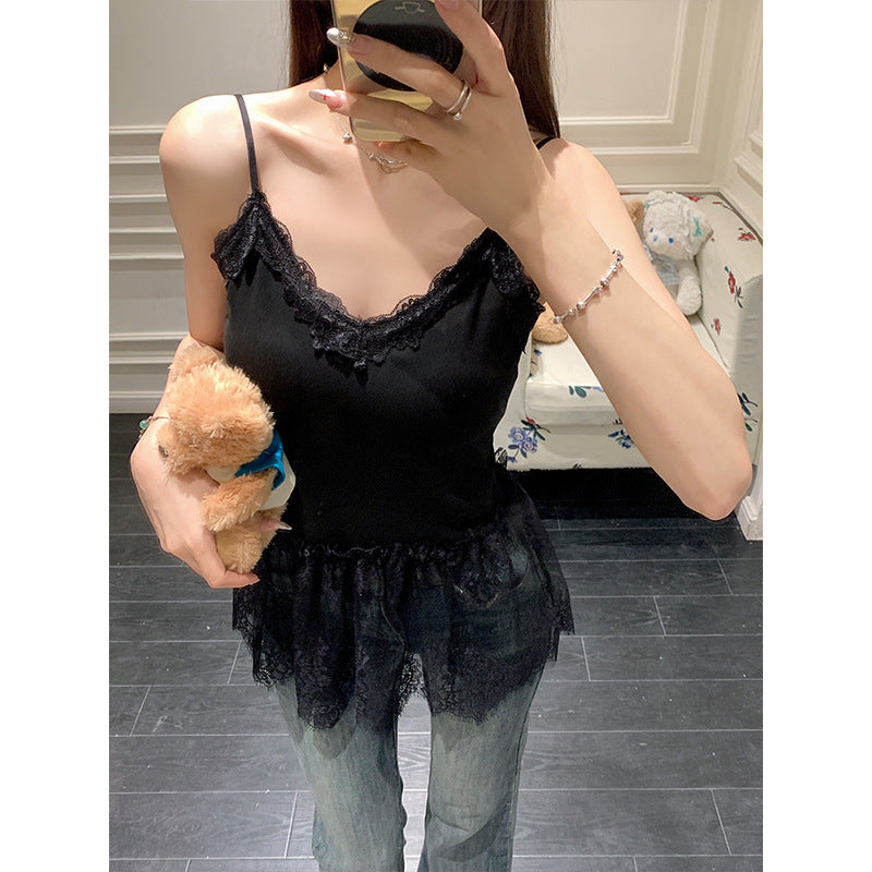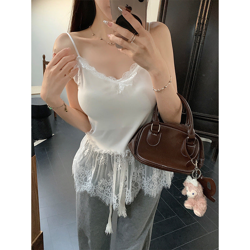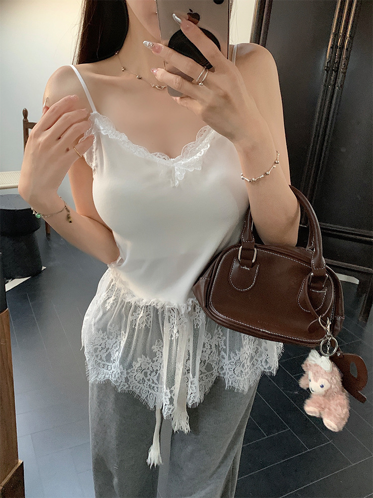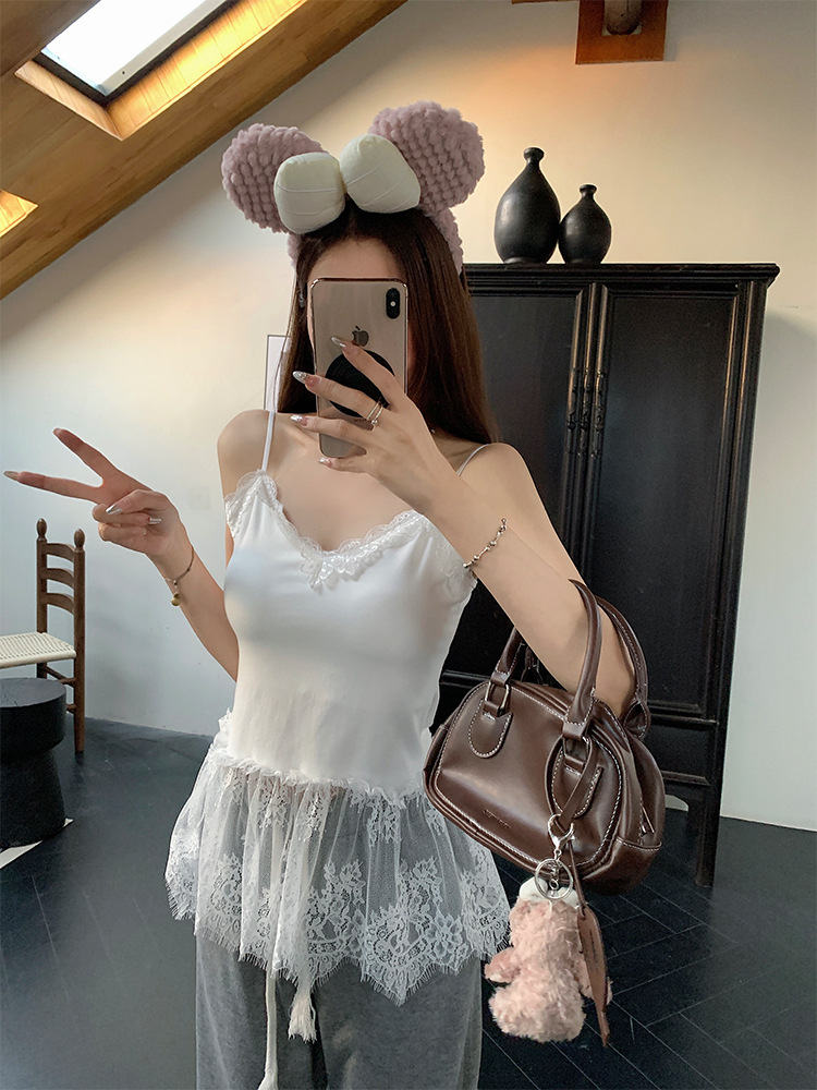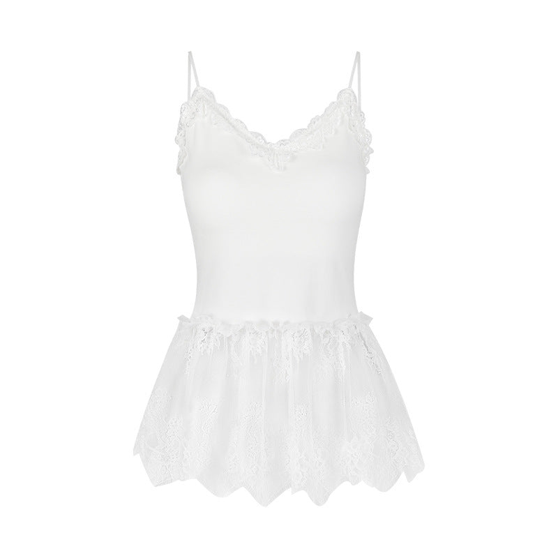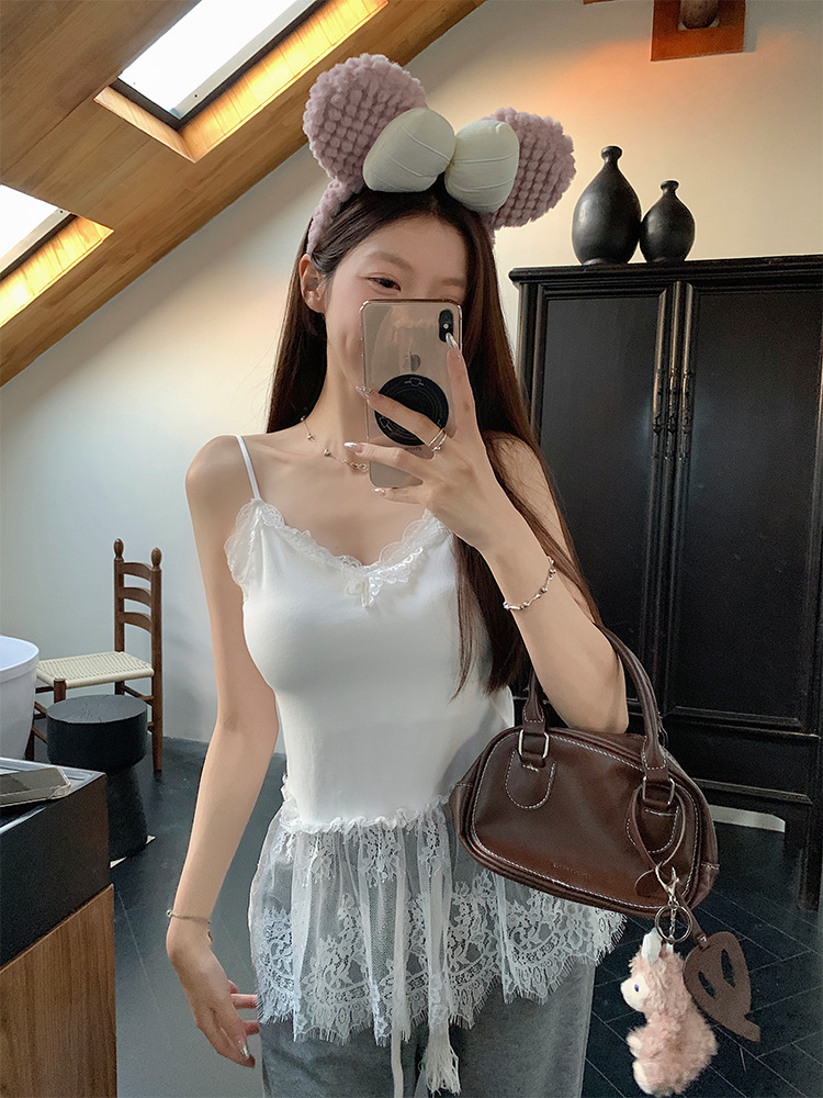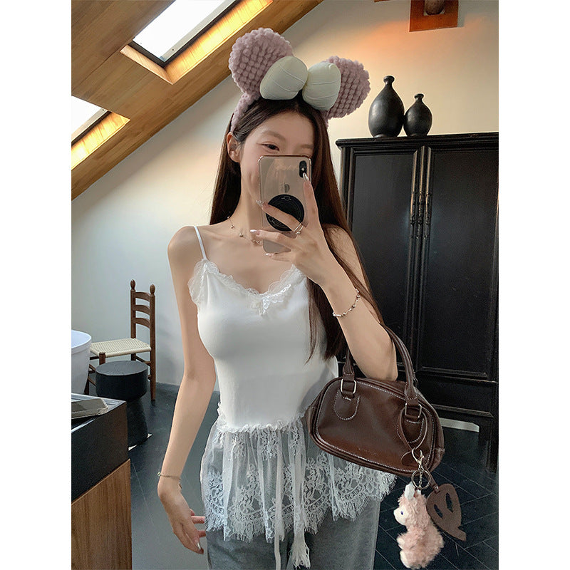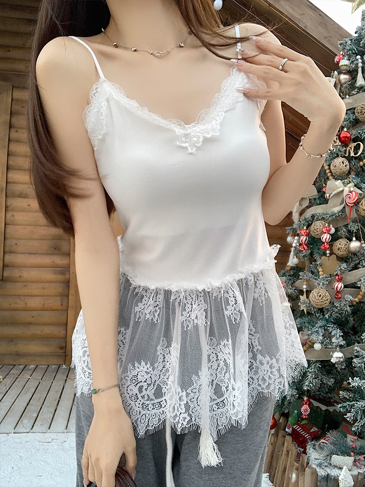 JMA-1041 实拍 春夏韩系叠穿白色V领蕾丝吊带背心女荷叶边屁帘无袖上衣