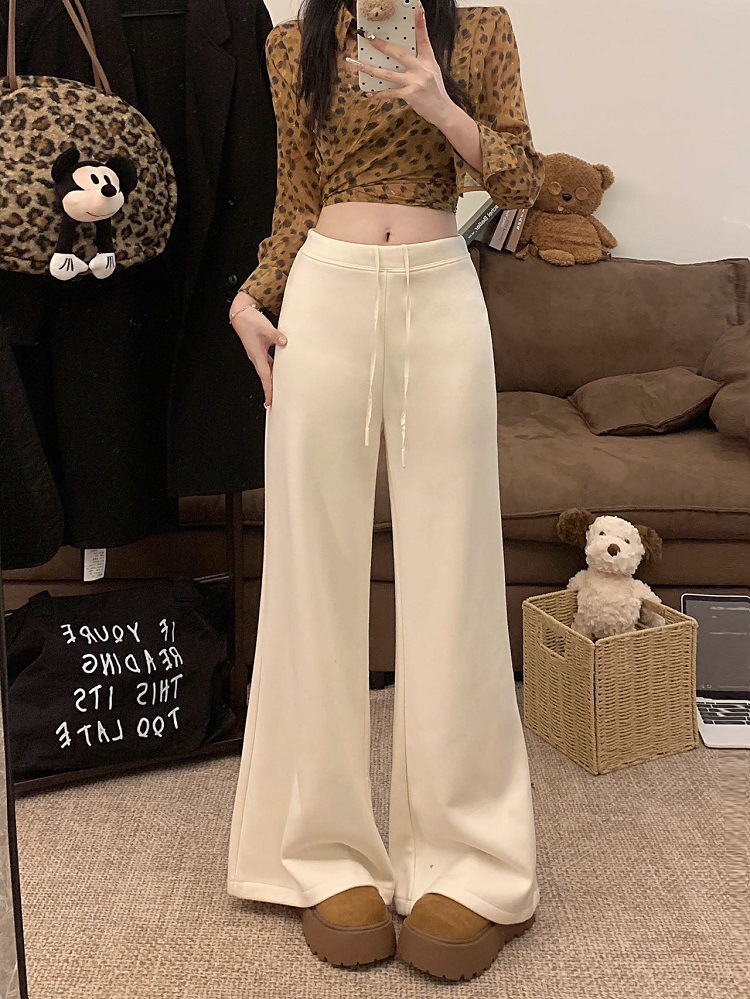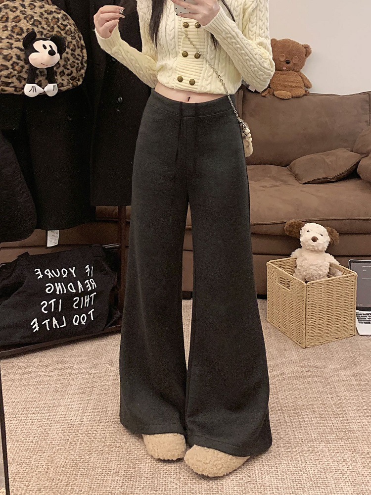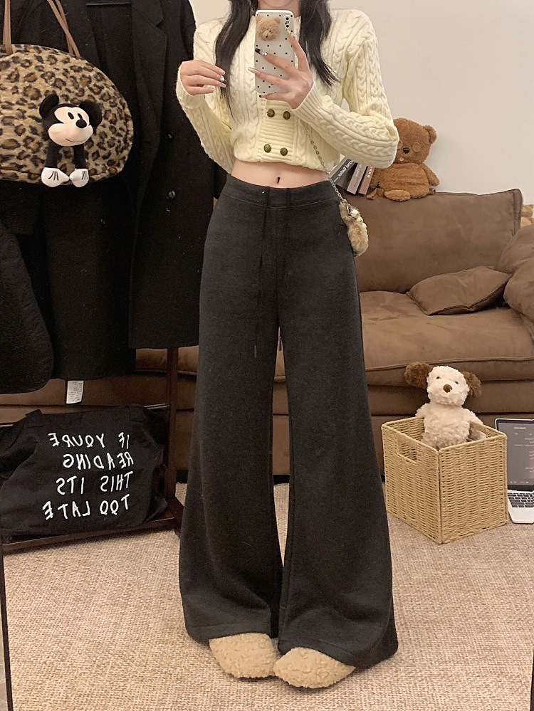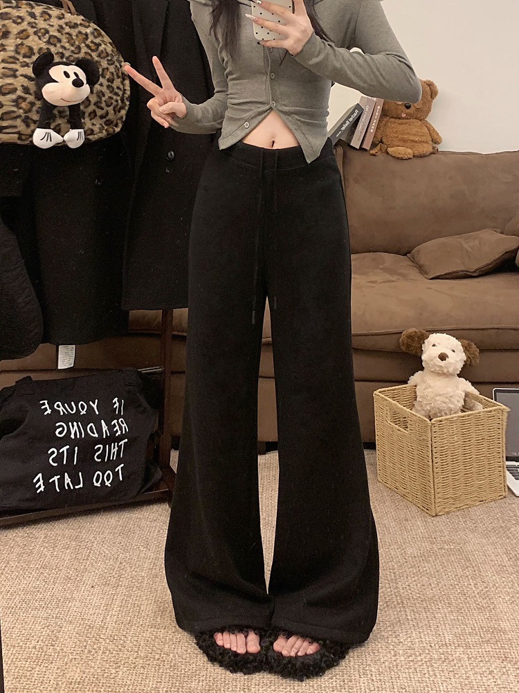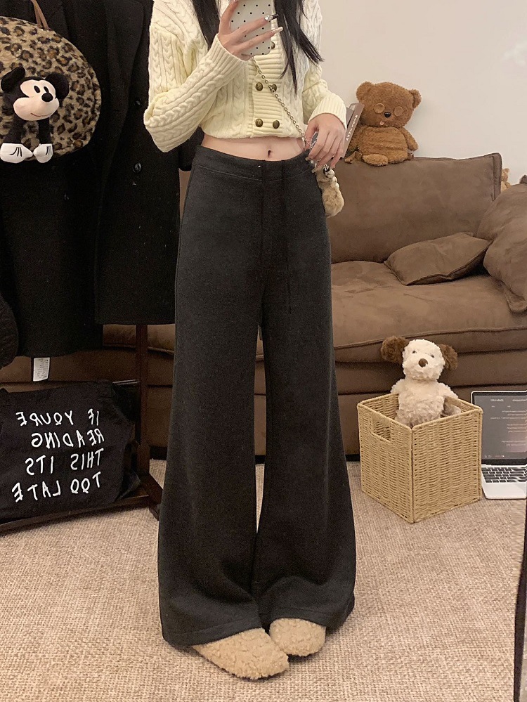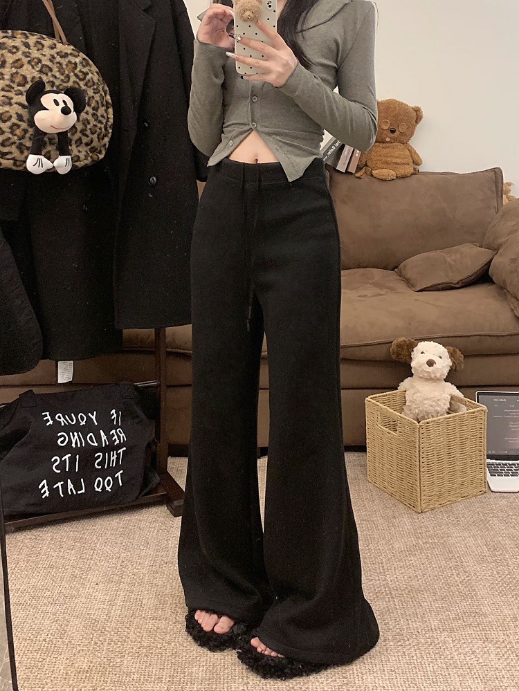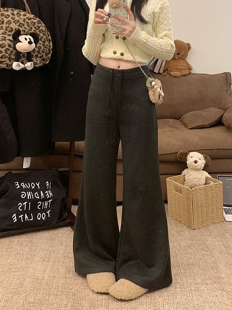 JMA-1042 实拍 慵懒风纯色羊绒显高微喇裤冬季松紧腰显瘦休闲阔腿裤拖地裤
