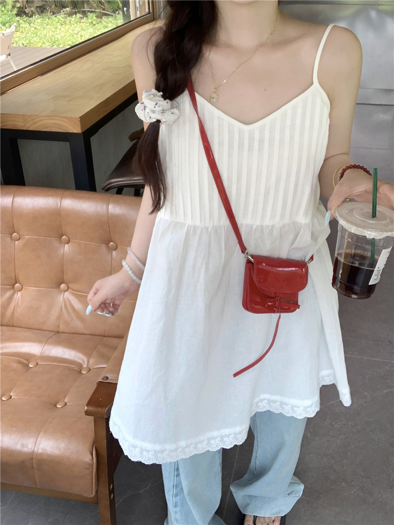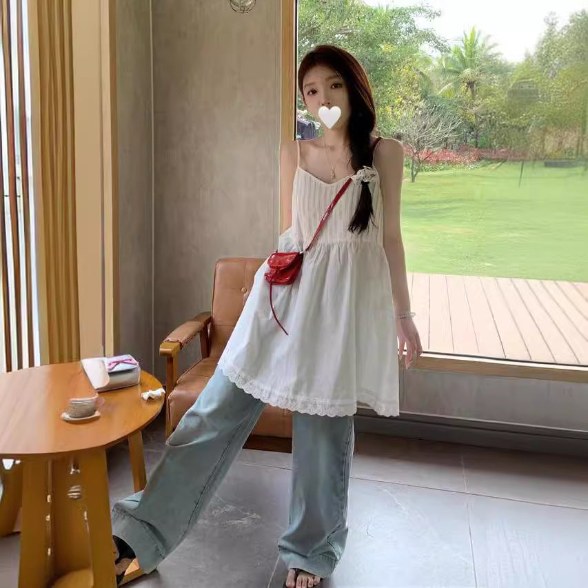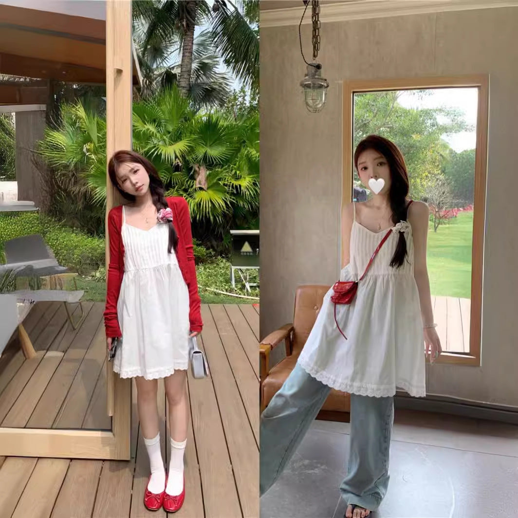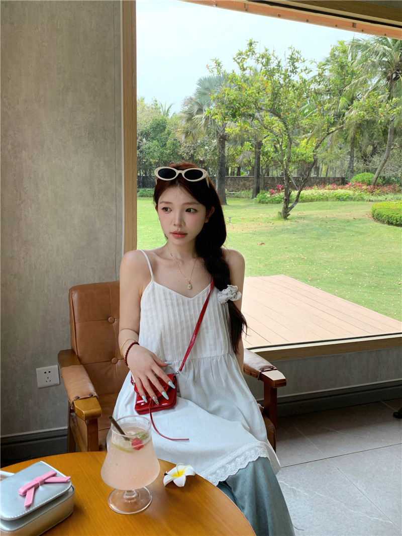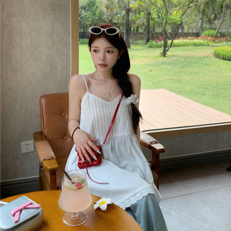JMA-1046 实拍 夏季新款韩版宽松减龄打条吊带裙花边拼接内搭叠穿吊带裙