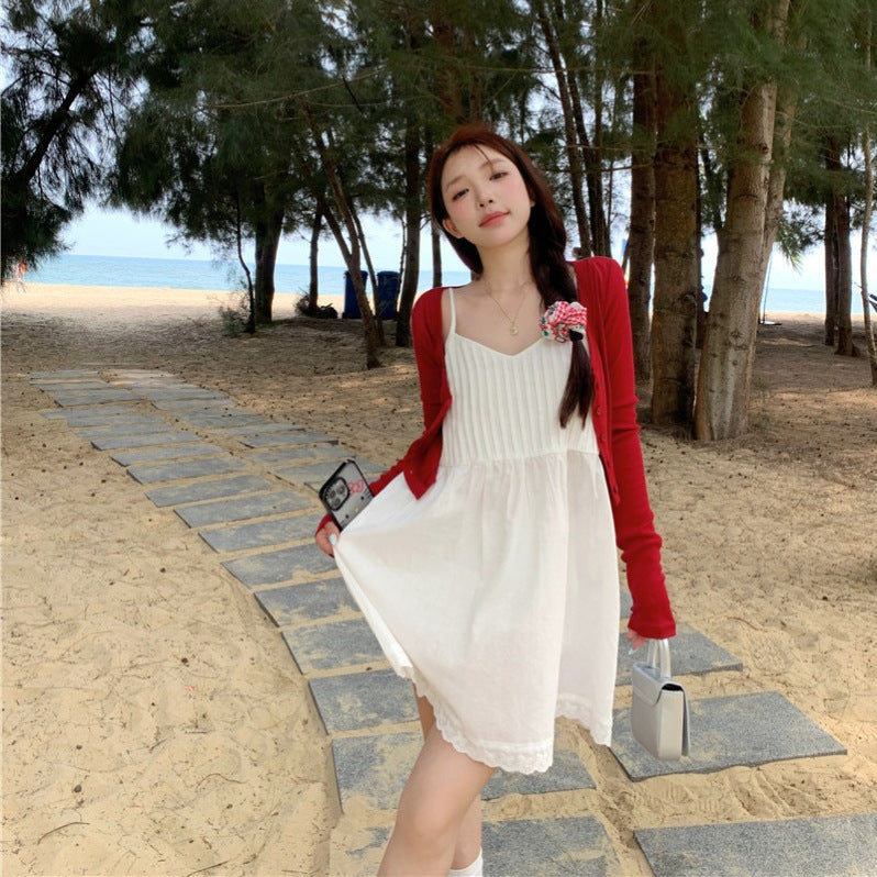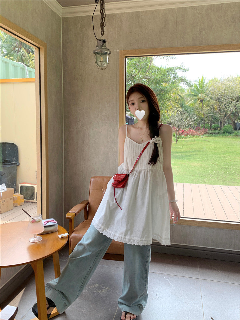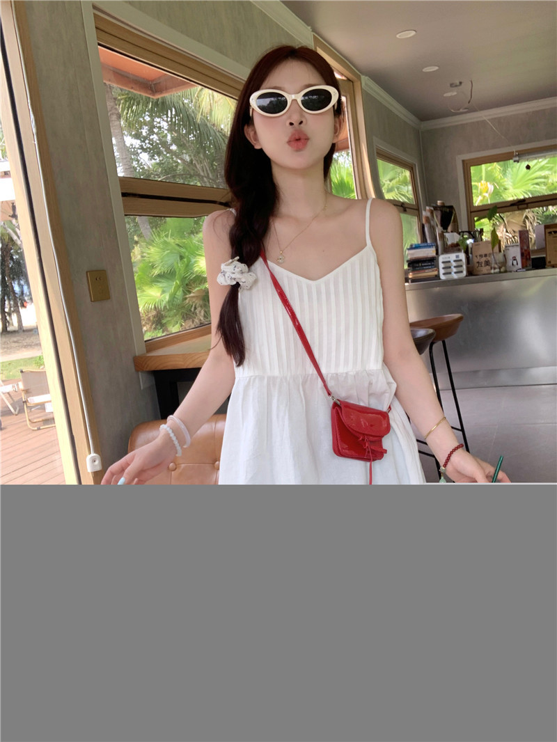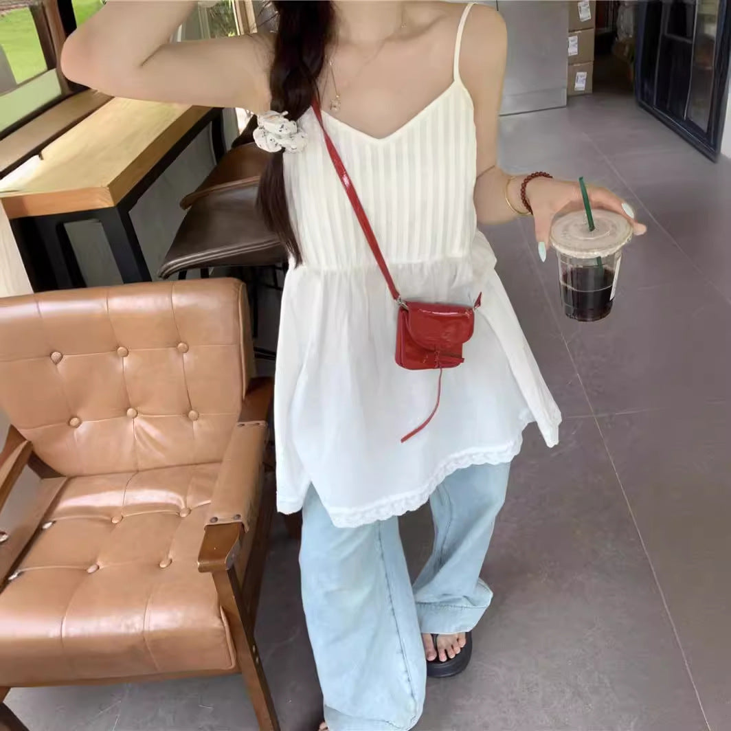 JMA-1046 实拍 夏季新款韩版宽松减龄打条吊带裙花边拼接内搭叠穿吊带裙