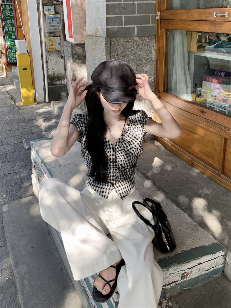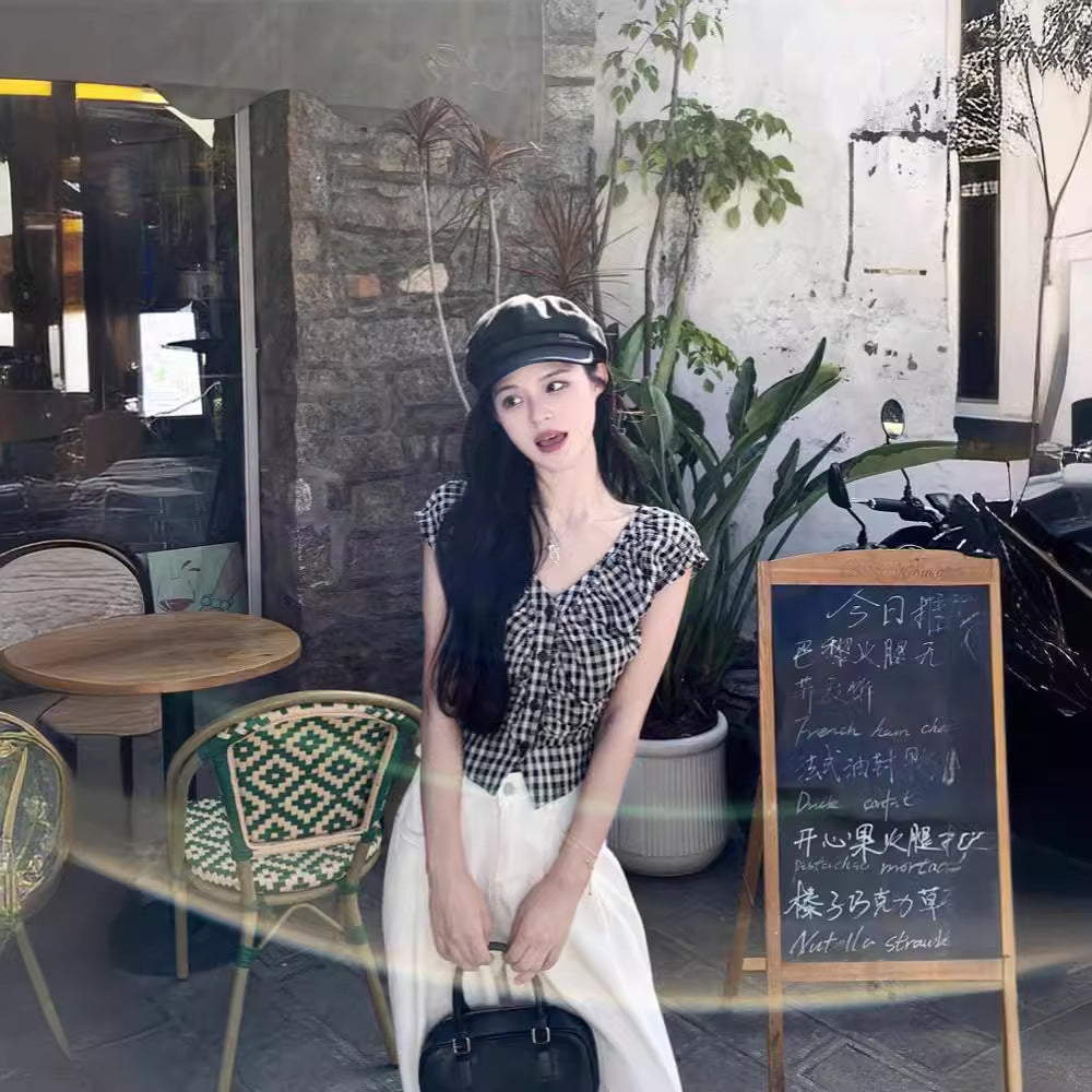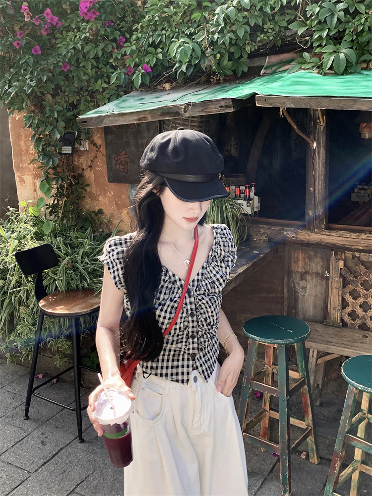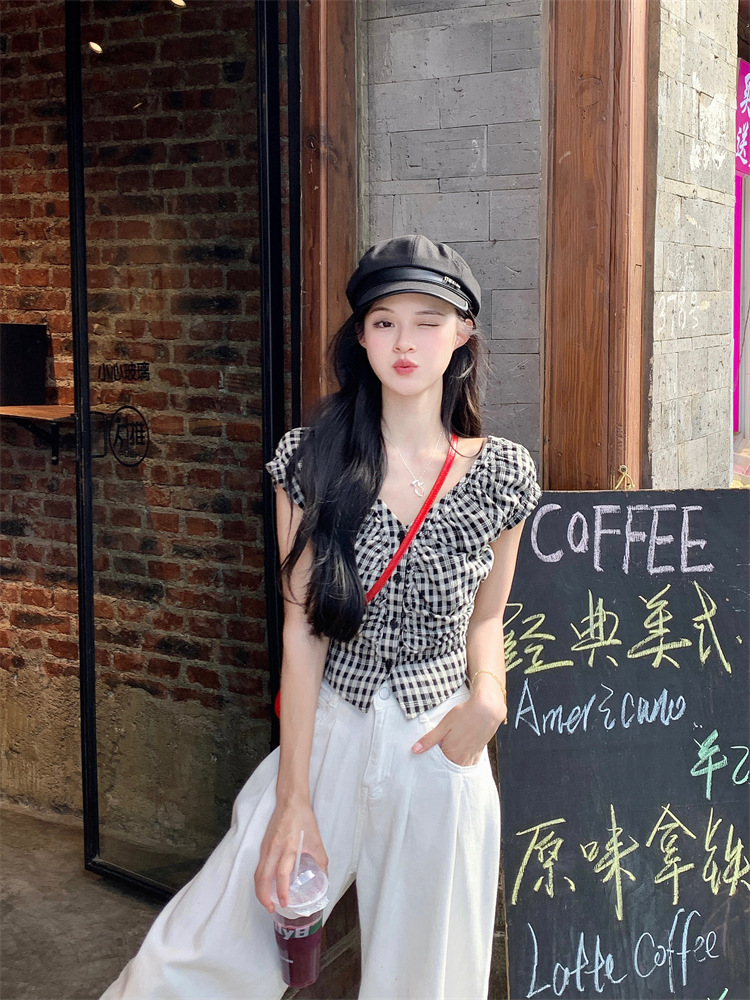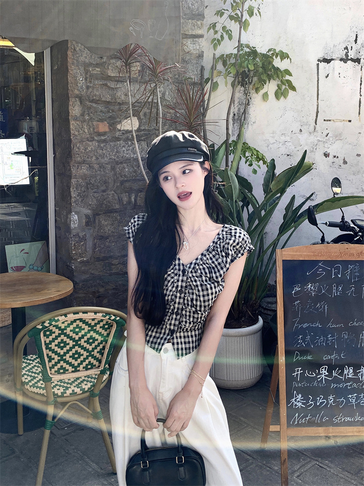 JMA-1047 实拍 法式黑白格子上衣小众V领衬衫女夏季设计感显瘦短款别致衬衣