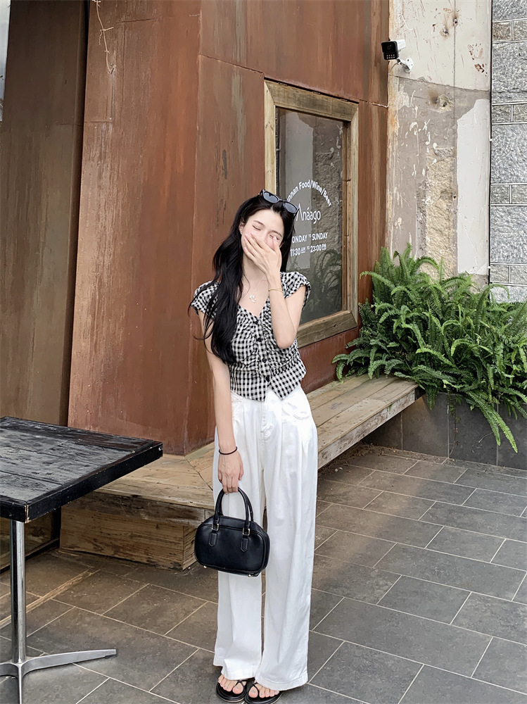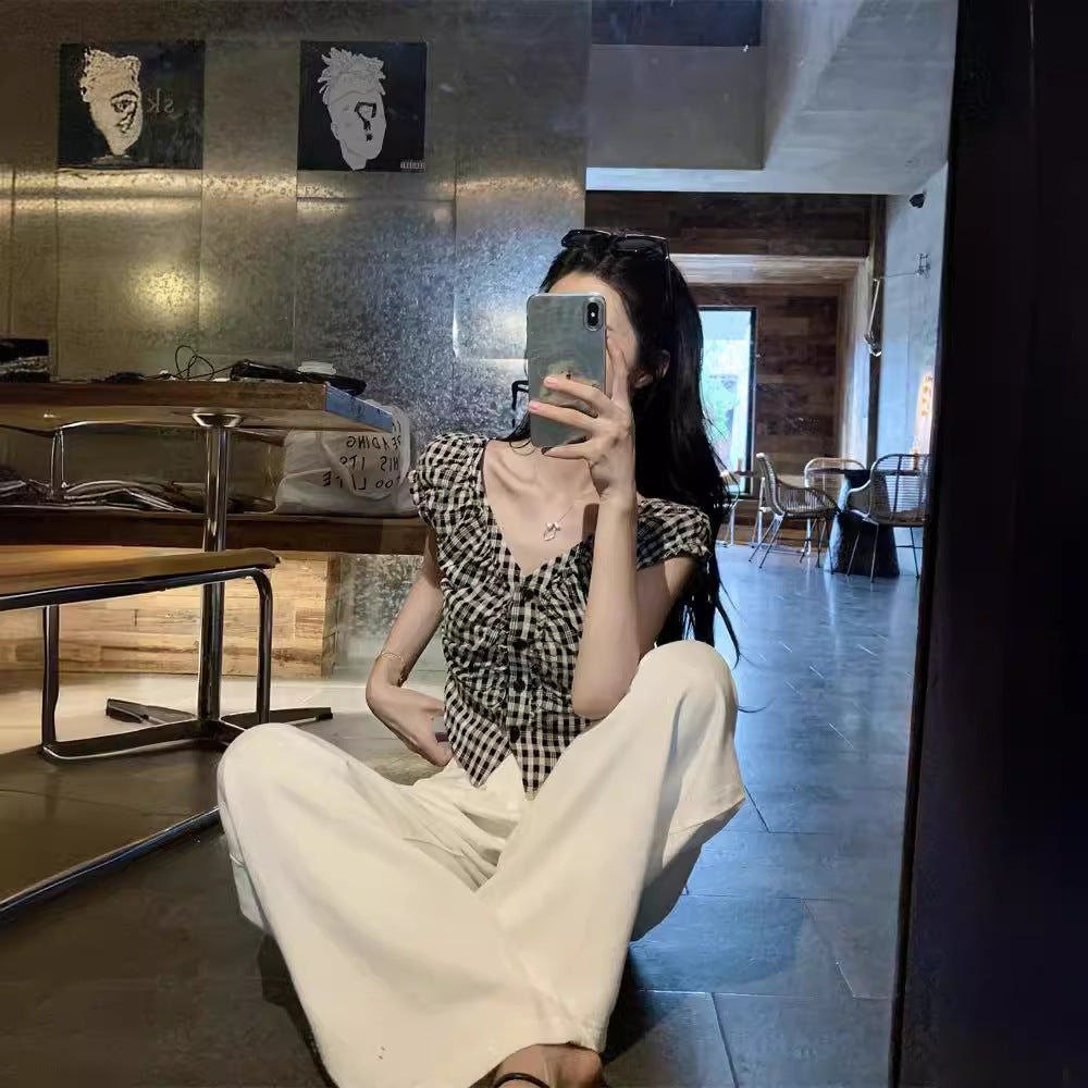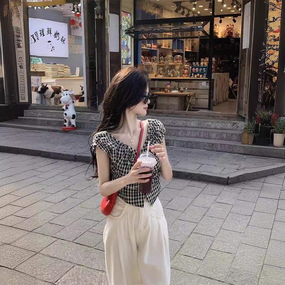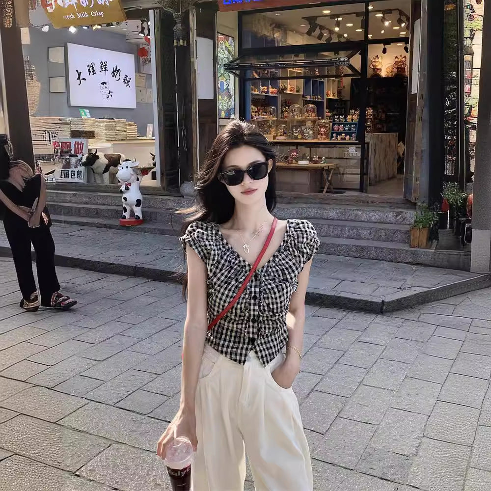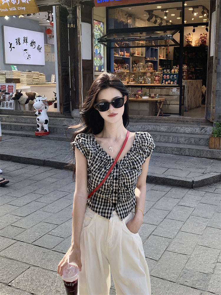 JMA-1047 实拍 法式黑白格子上衣小众V领衬衫女夏季设计感显瘦短款别致衬衣
