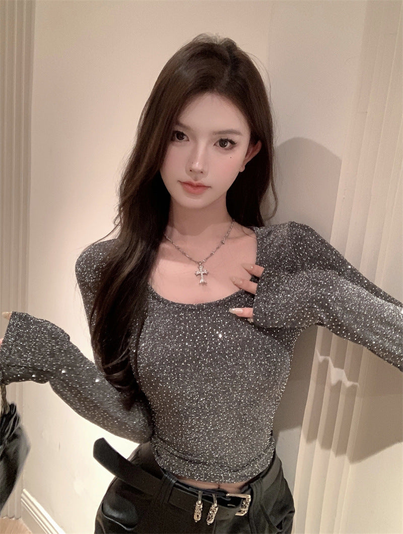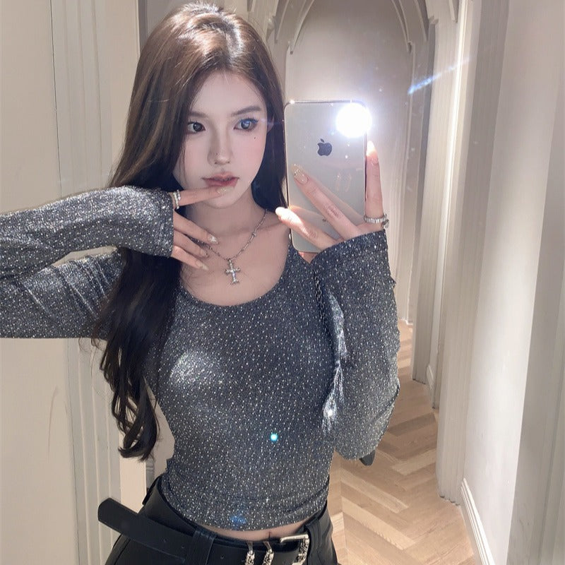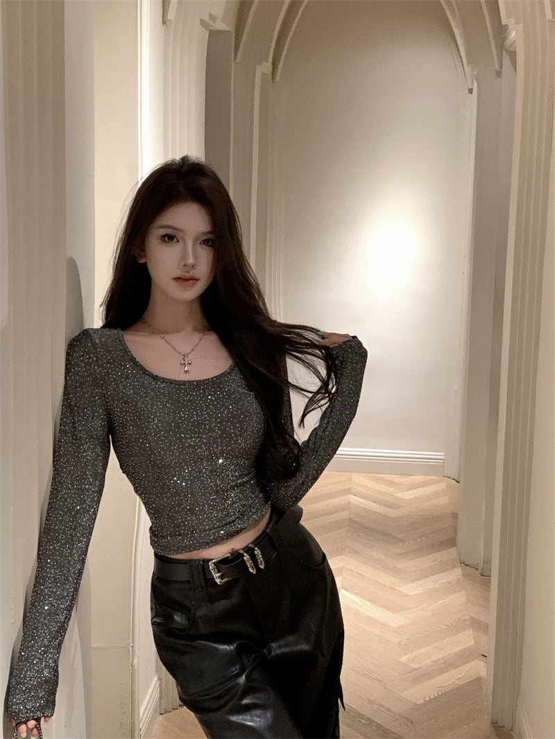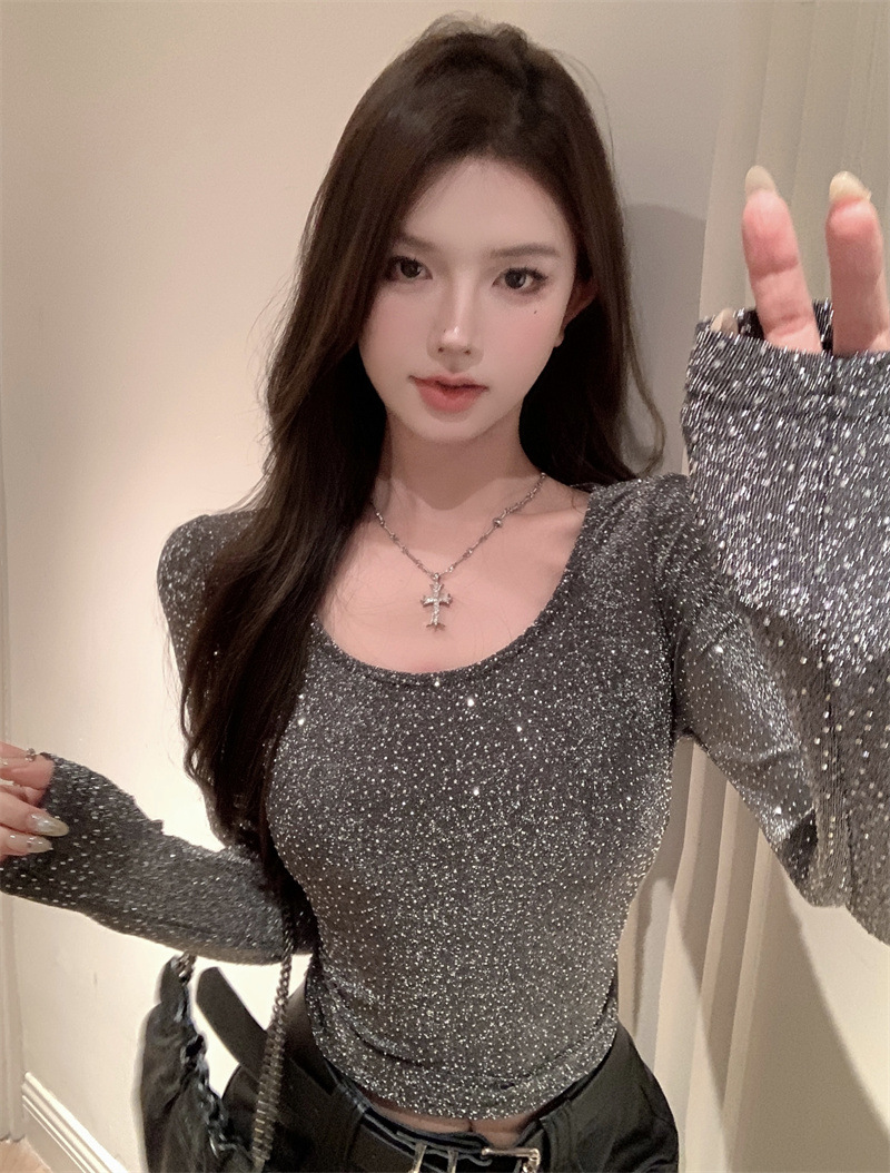 JMA-1056实拍~碎闪星河时尚烫钻设计感长袖修身内搭T恤打底衫上衣女