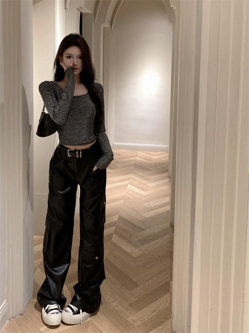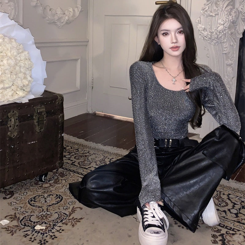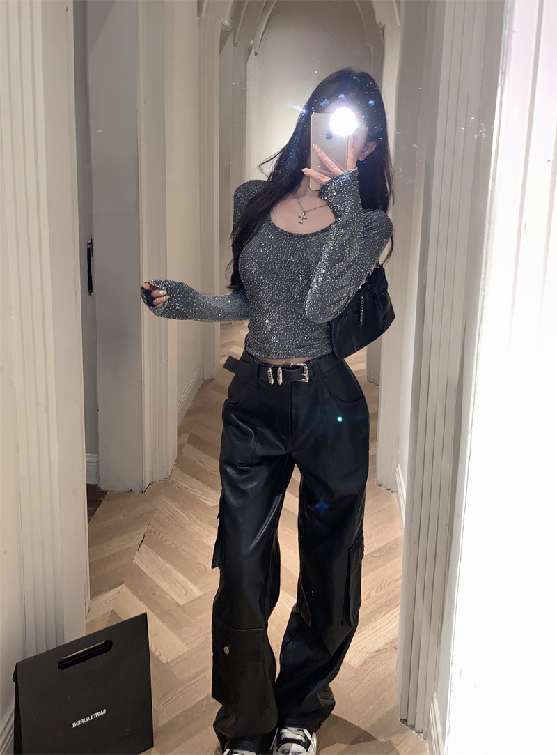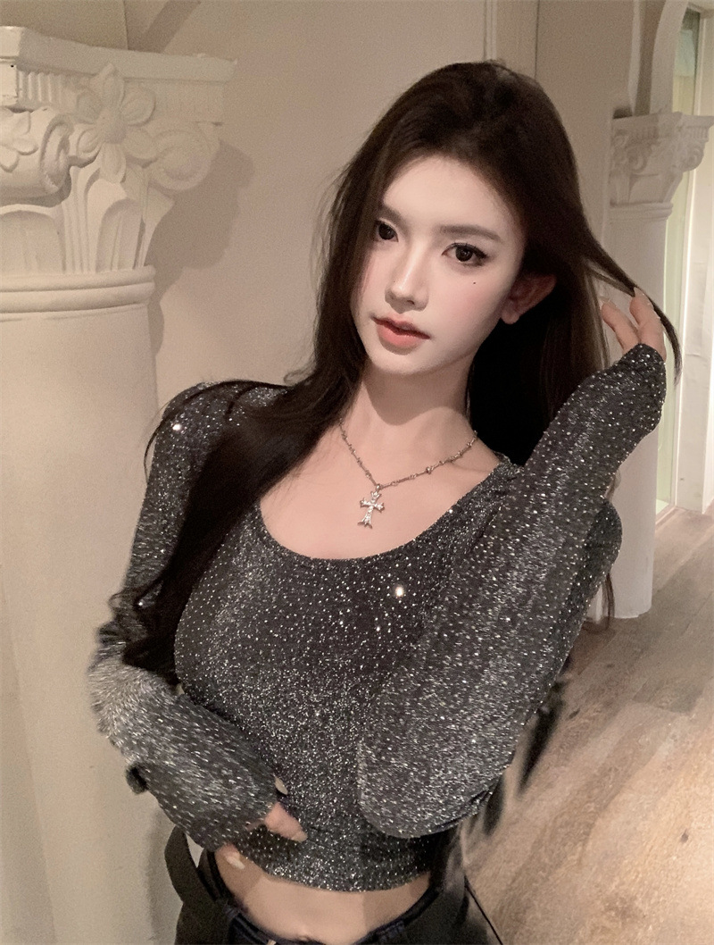 JMA-1056实拍~碎闪星河时尚烫钻设计感长袖修身内搭T恤打底衫上衣女