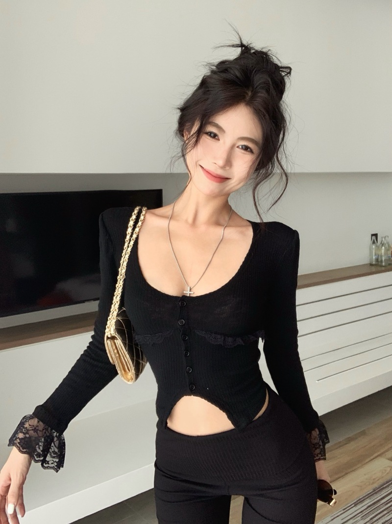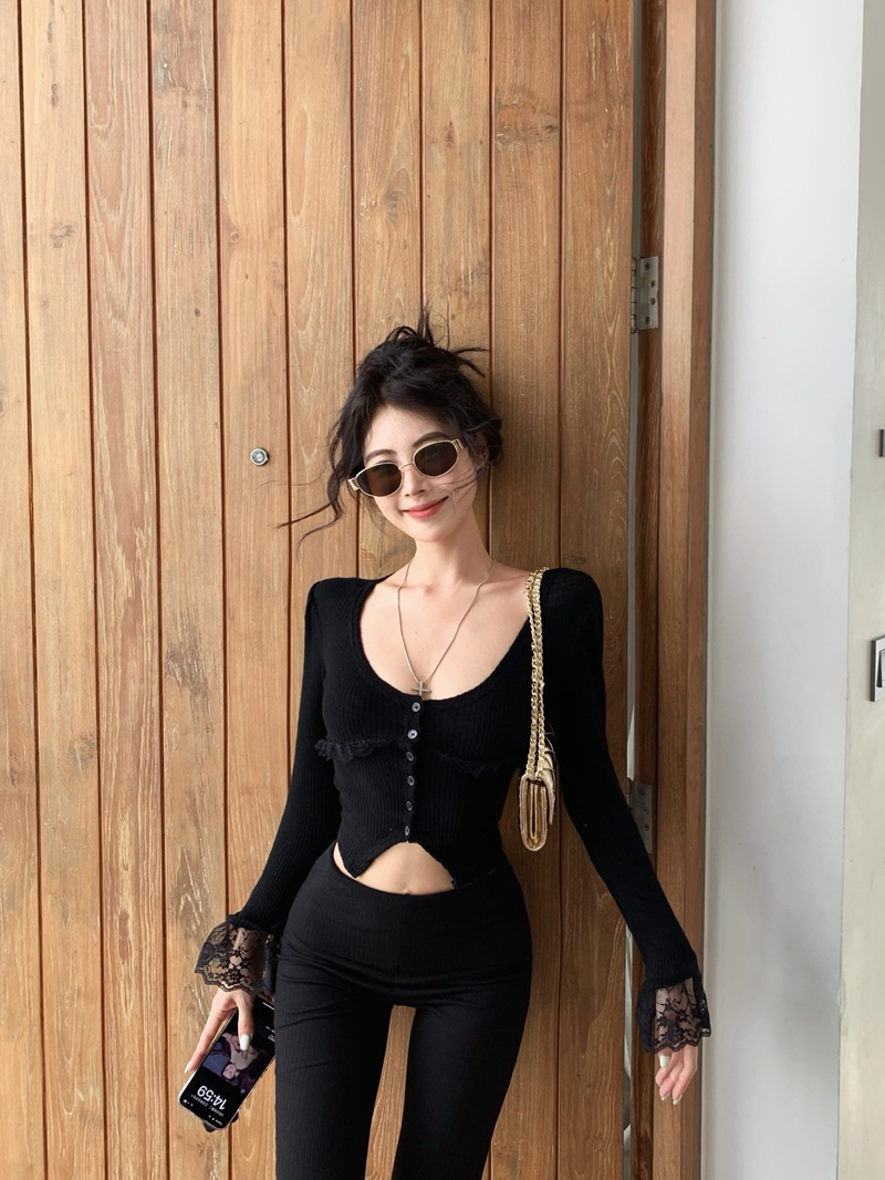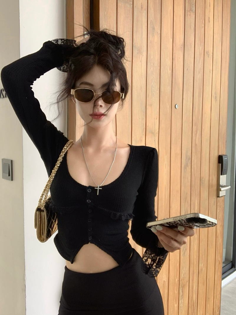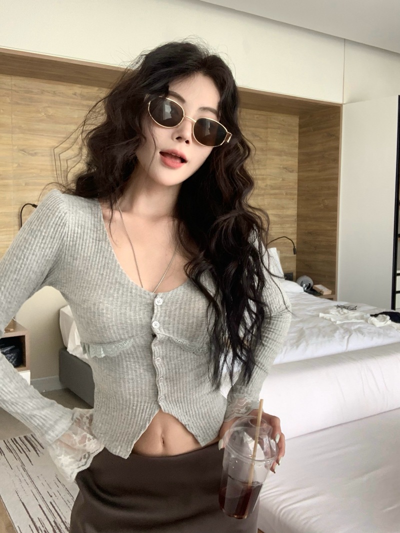 JMA-106 实拍 春季复古辣妹心机V领蕾丝花边修身短款显瘦长袖开衫上衣