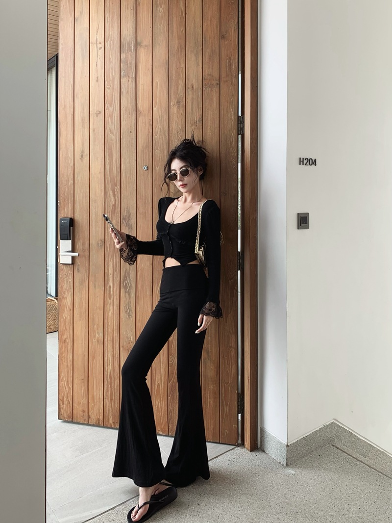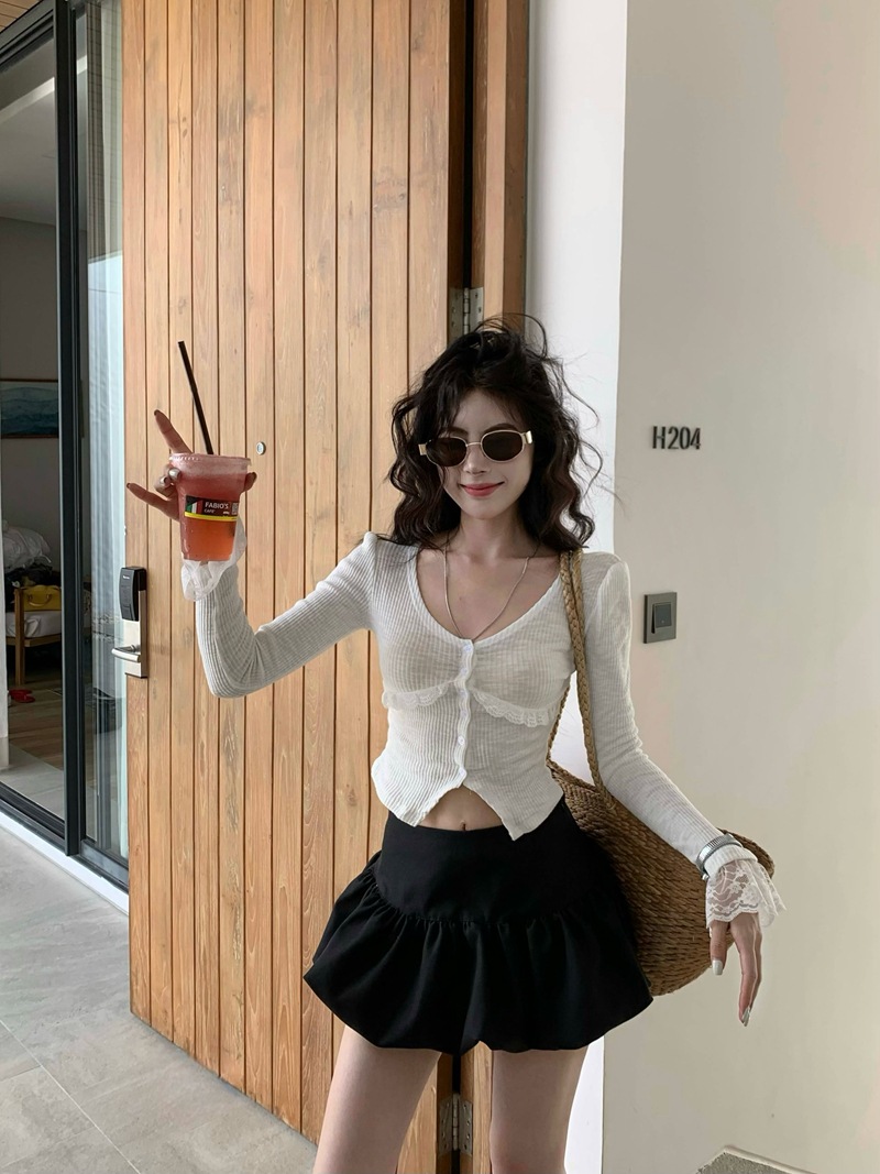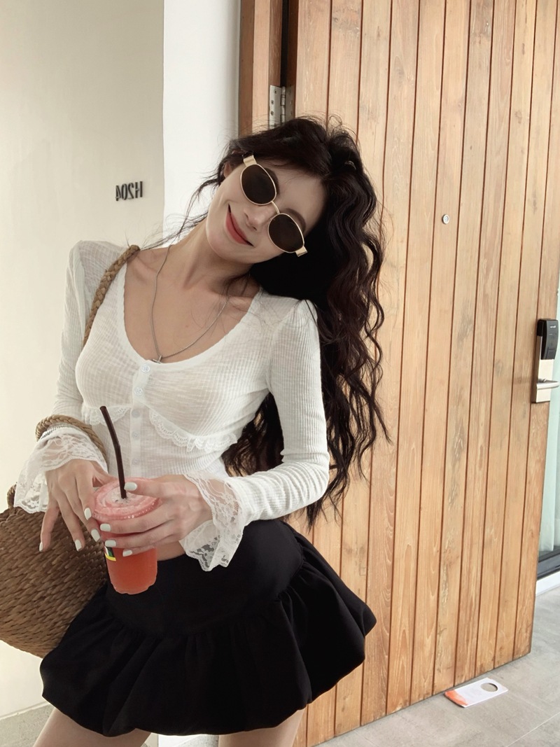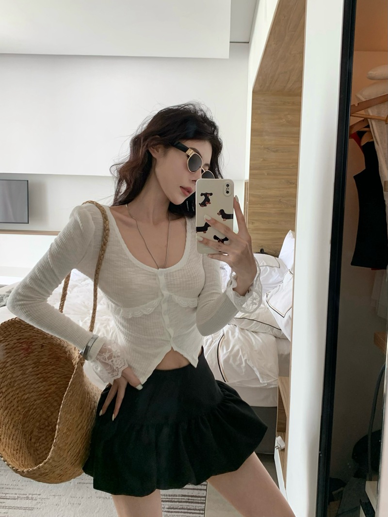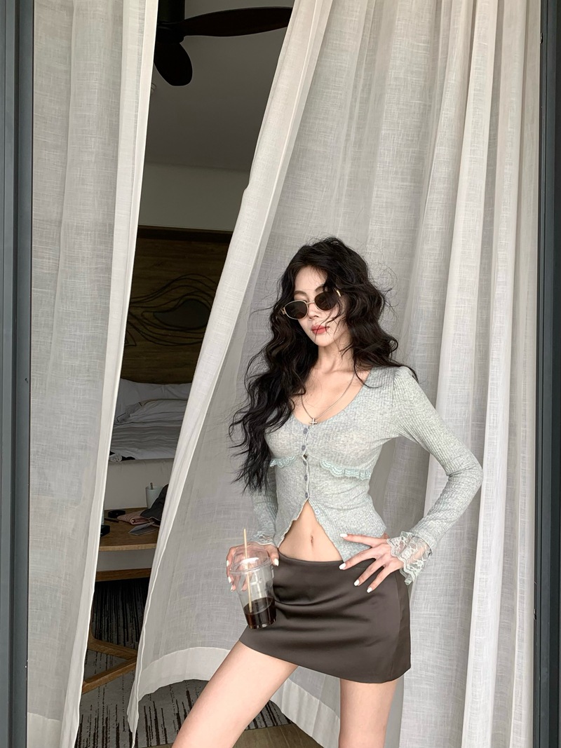 JMA-106 实拍 春季复古辣妹心机V领蕾丝花边修身短款显瘦长袖开衫上衣